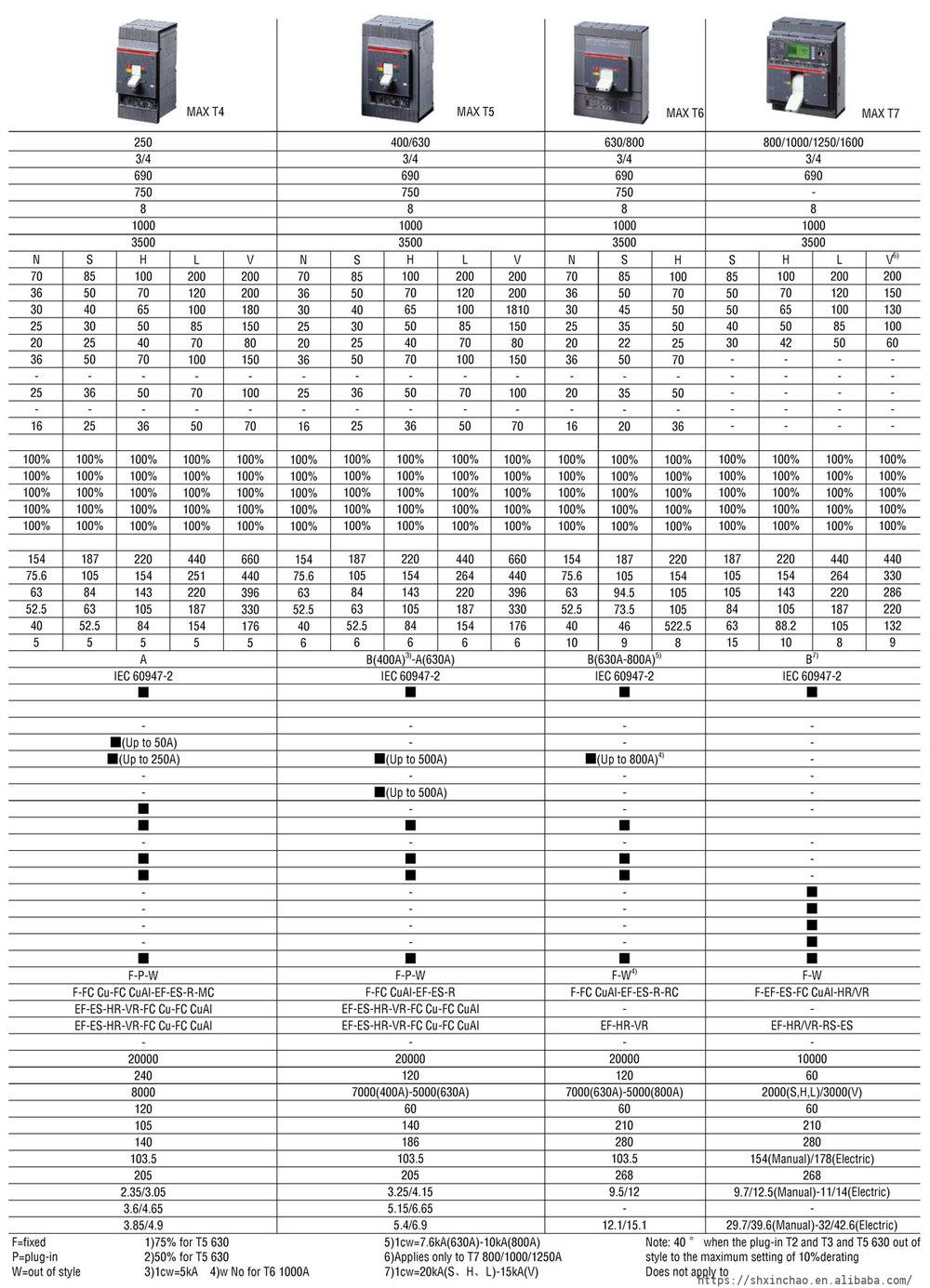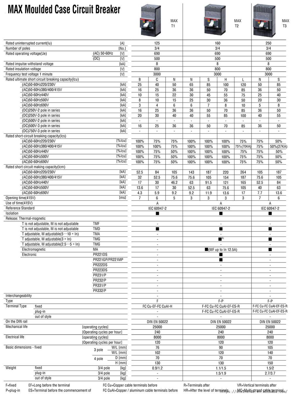 La familia Tmax ahora está disponible como una gama completa de interruptores automáticos en caja moldeada de hasta 1600 A. Todos los interruptores automáticos, tanto tripolares como tetrapolares, están disponibles en la versión fija; los tamaños T4 y T5 en la versión enchufable y T4, T5, T6 y T7 también en la extraíble. Con el mismo tamaño de bastidor, los interruptores automáticos de la familia Tmax, están disponibles con diferentes poderes de corte y diferentes intensidades asignadas ininterrumpidas.