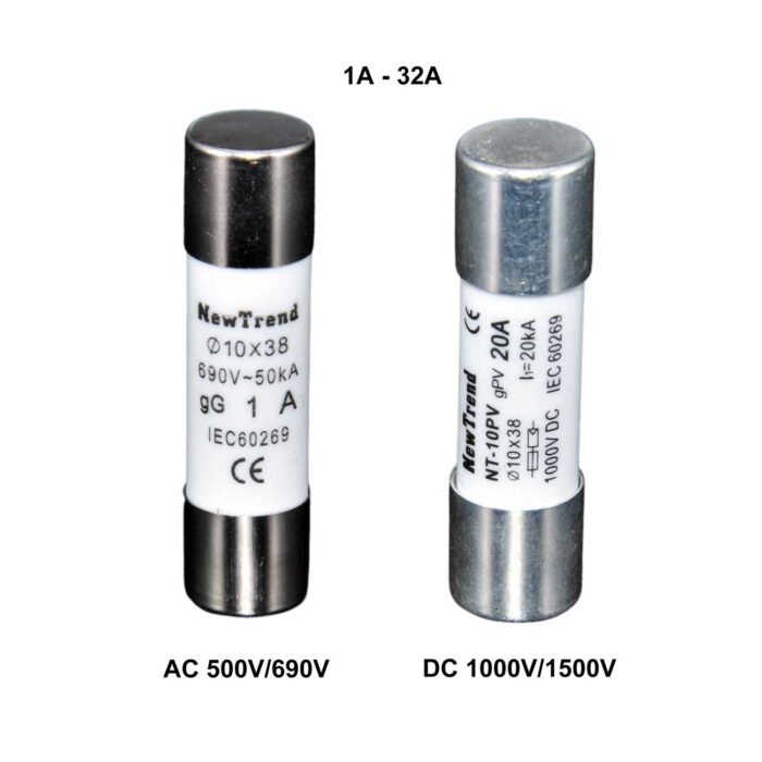 10x38mm Cylinder Fuses are mainly used in AC or DC circuit, rated voltage up to 1500V, rated current up to 32A, for circuit protection against overload and short circuit (type gG), also available for protection of semiconductor parts and equipment against short circuit (type aR), protection of motor (type aM). Compliant with IEC 60269 standard.