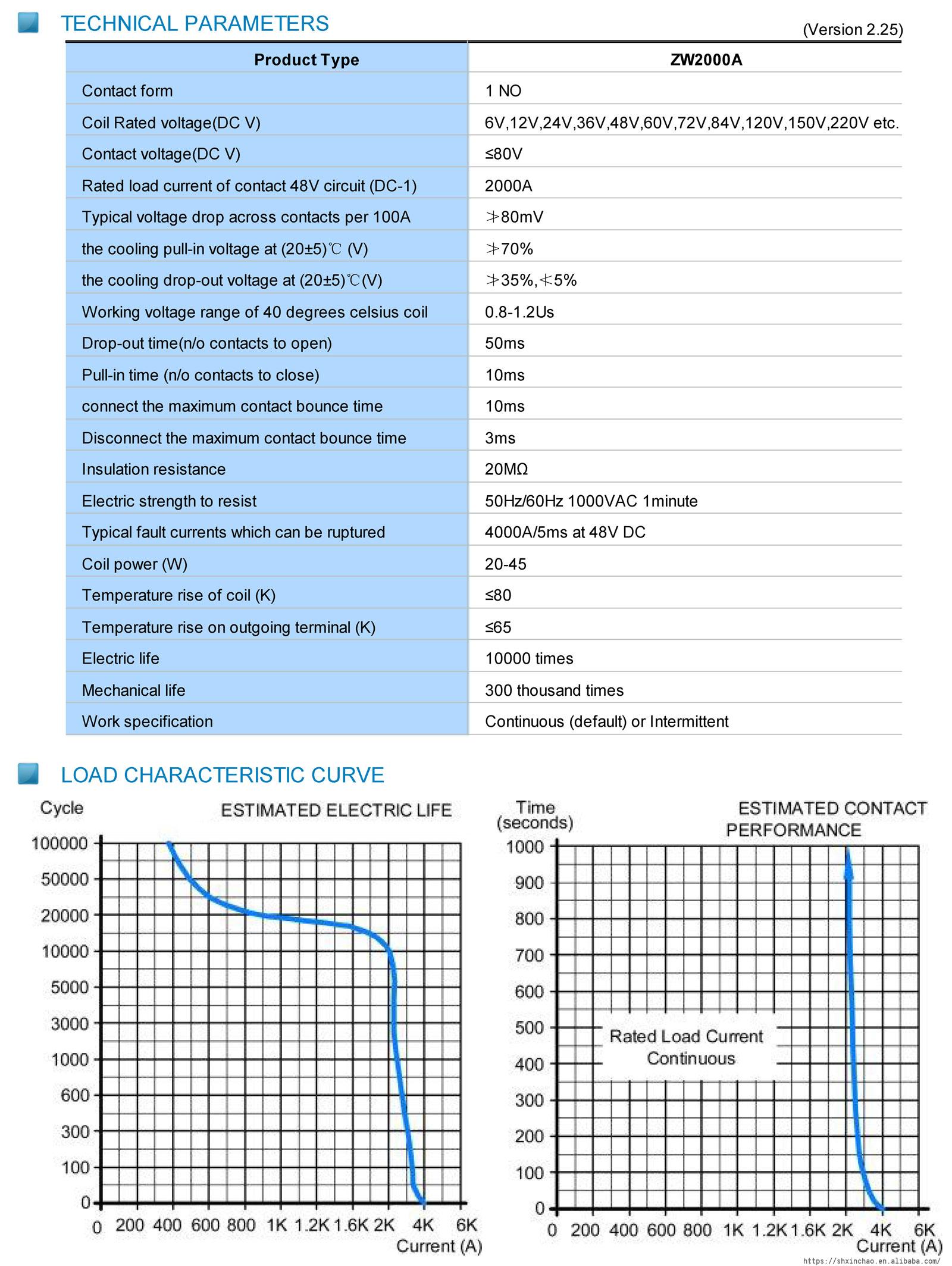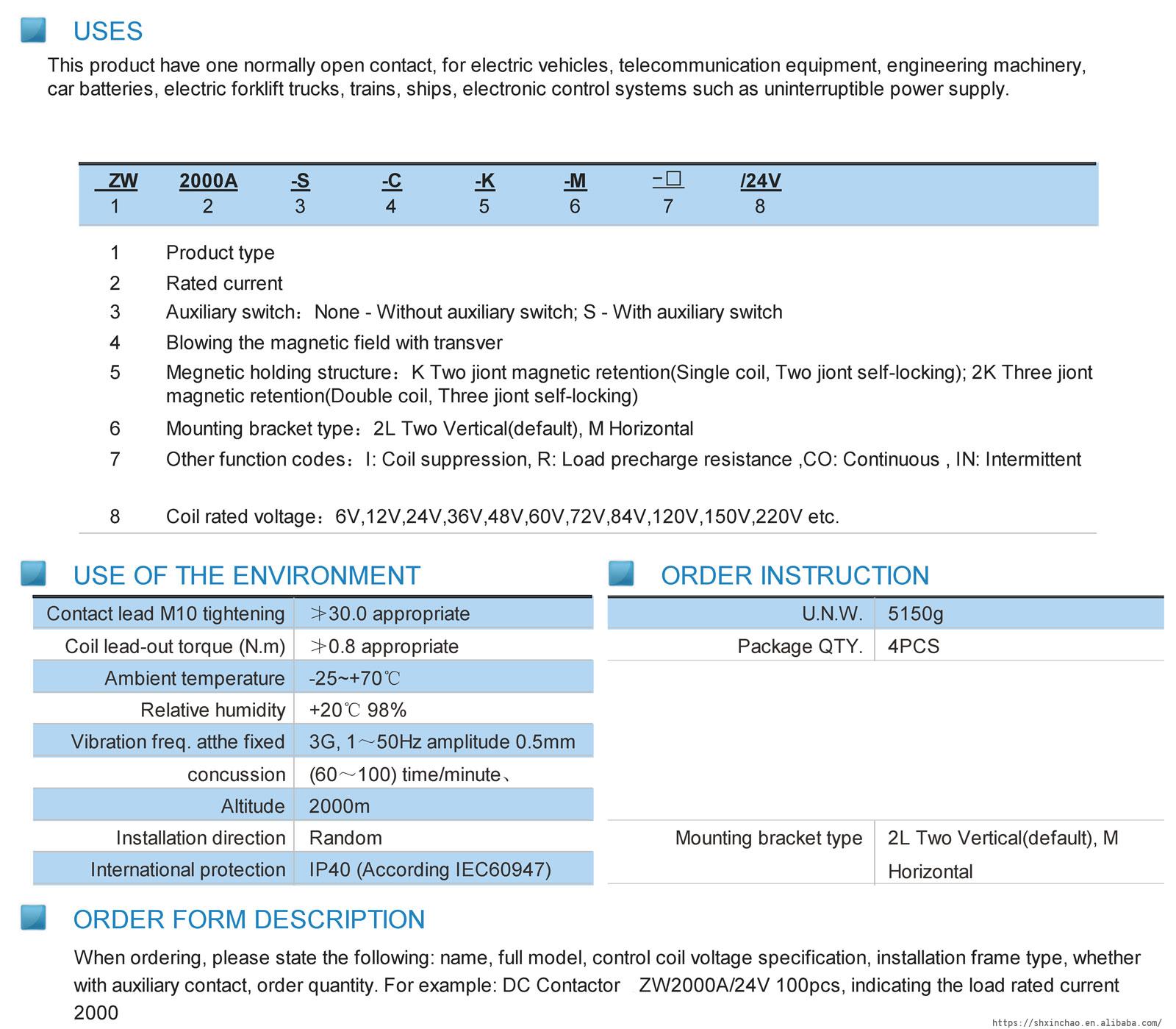 ZW1600A/ZW2000A/ZW3000A DC Contactor has one normally open contact, for electric vehicles, telecommunication equipment, engineering machinery, car batteries, electric forklift trucks, trains, ships, electronic control systems such as uninterruptible power supply.
