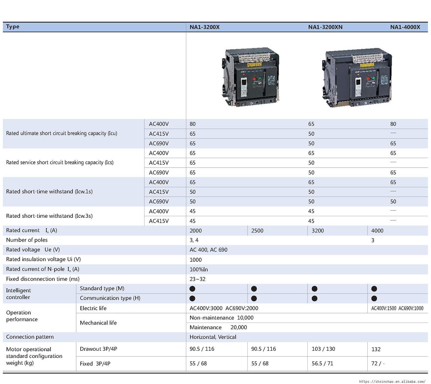 Chint NA1 series air circuit breaker is suitable for the circuit of AC 50Hz/60Hz with rated service voltage 400V, 690V and rated service current up to 6300A. It is mainly used to distribute electric energy and protect circuits and electric equipment against over-load, under-voltage, short-circuit and single-phase earthing fault.