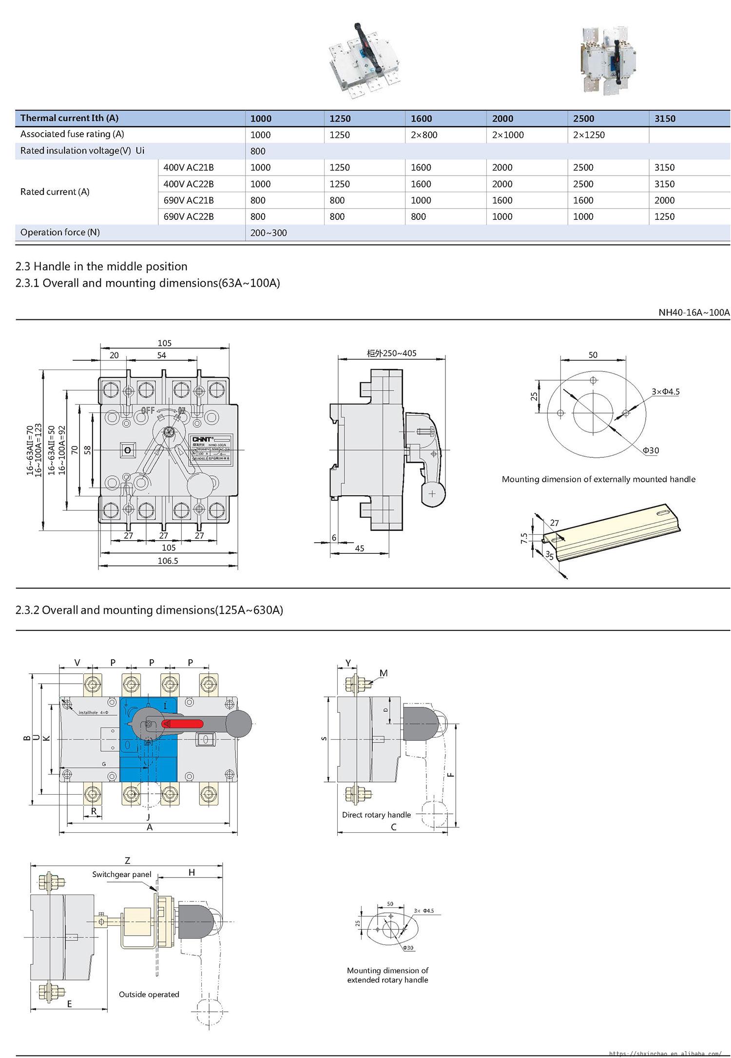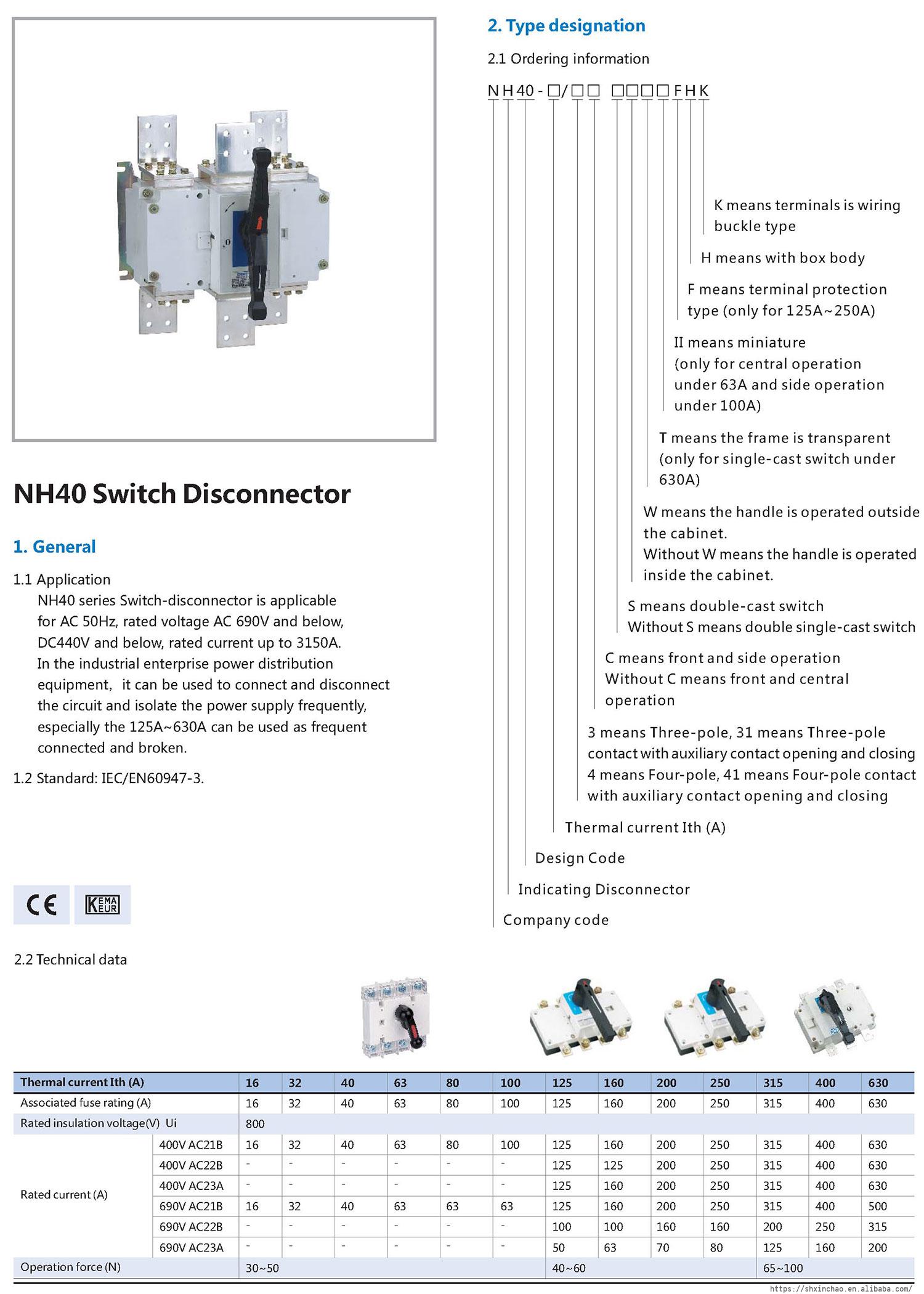 Chint NH40 series Switch-disconnector is applicable for AC 50Hz, rated voltage AC 690V and below, DC440V and below, rated current up to 3150A. In the industrial enterprise power distribution equipment,it can be used to connect and disconnect the circuit and isolate the power supply frequently, especially the 125A~630A can be used as frequent connected and broken.