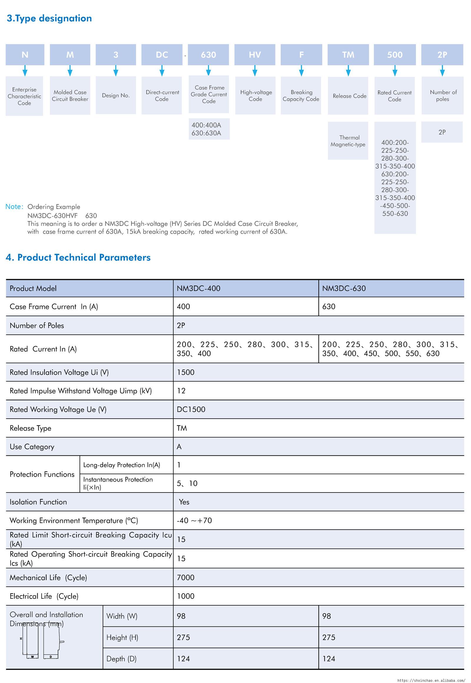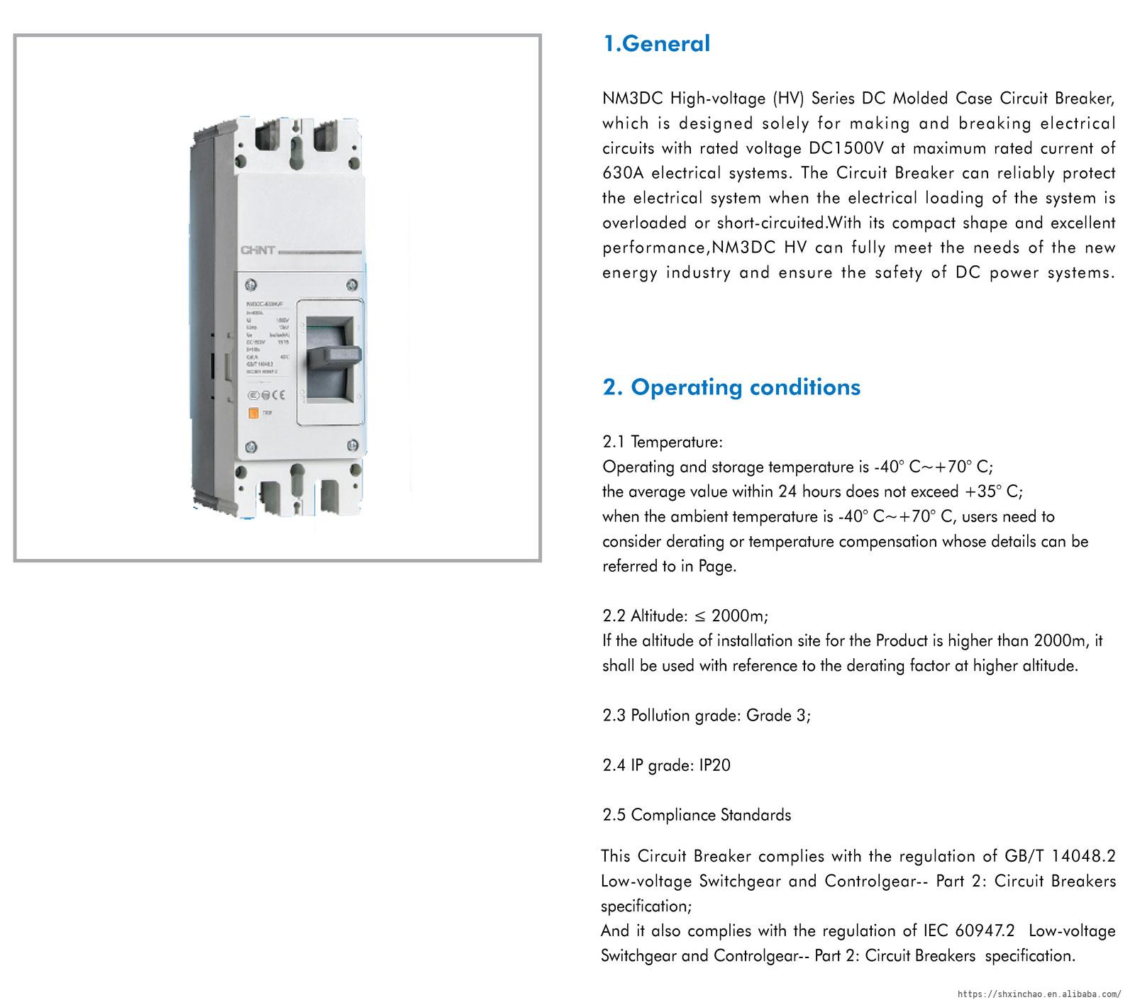 Chint NM3DC High-voltage (HV) Series DC Molded Case Circuit Breaker, which is designed for making and breaking electrical circuits with rated voltage DC1500V at maximum rated current of 630A electrical systems. The Circuit Breaker can reliably protect the electrical system when the system is overloaded or short-circuited.With its compact shape and excellent performance,NM3DC HV can fully meet the needs of the new energy industry and ensure the safety of DC power systems.