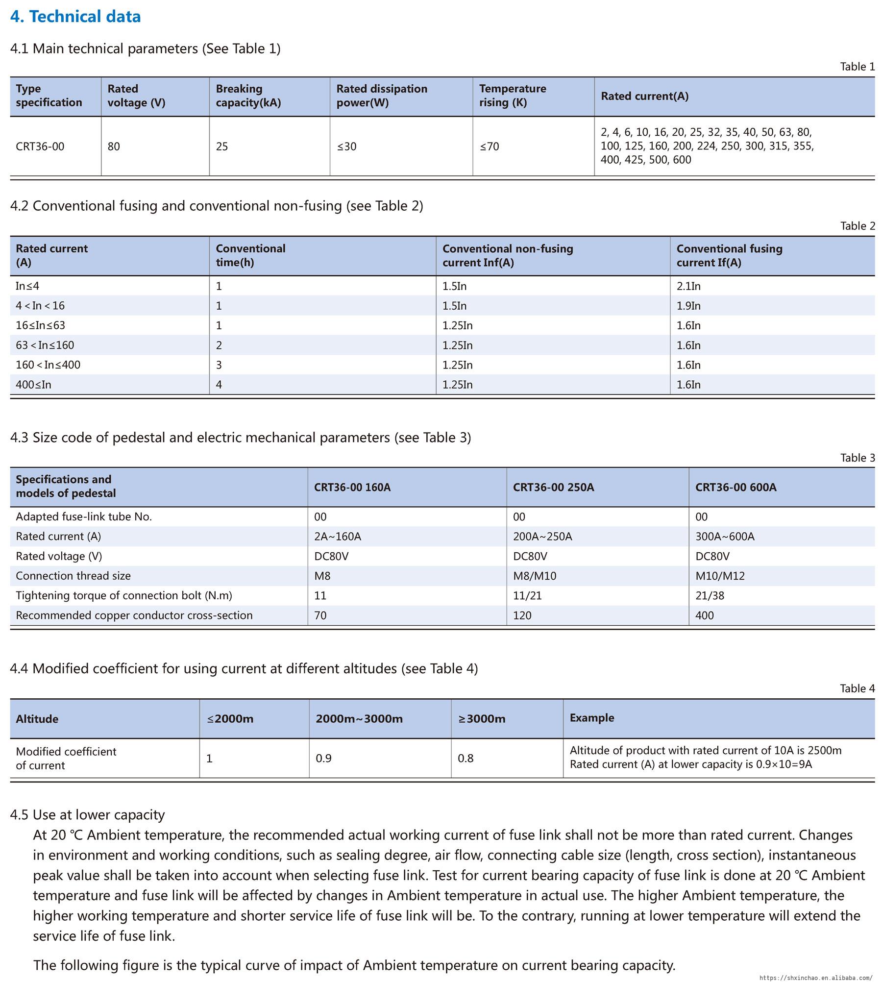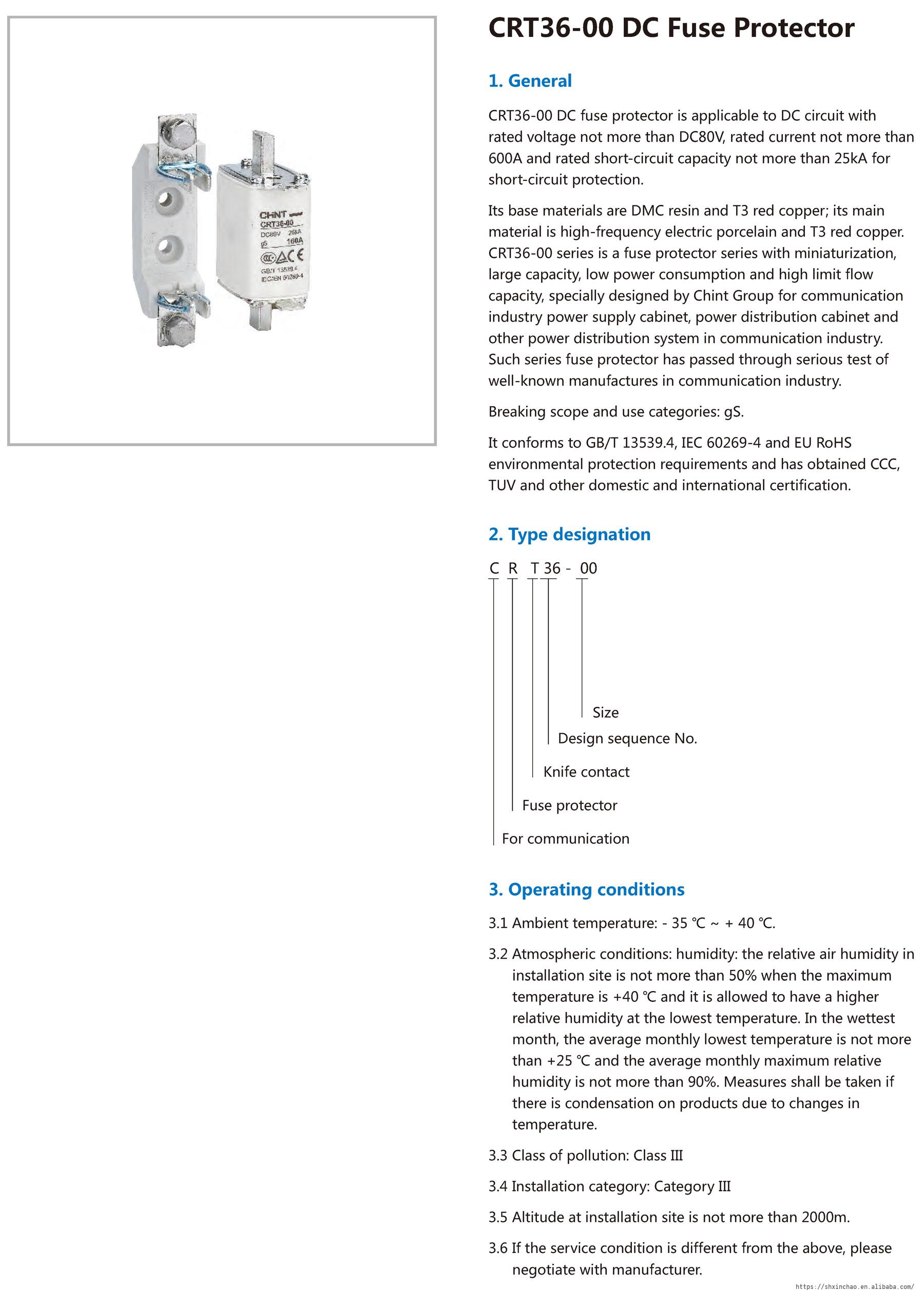 Chint CRT36-00 DC fuse protector is applicable to DC circuit with rated voltage not more than DC80V, rated current not more than 600A and rated short-circuit capacity not more than 25kA for short-circuit protection.
