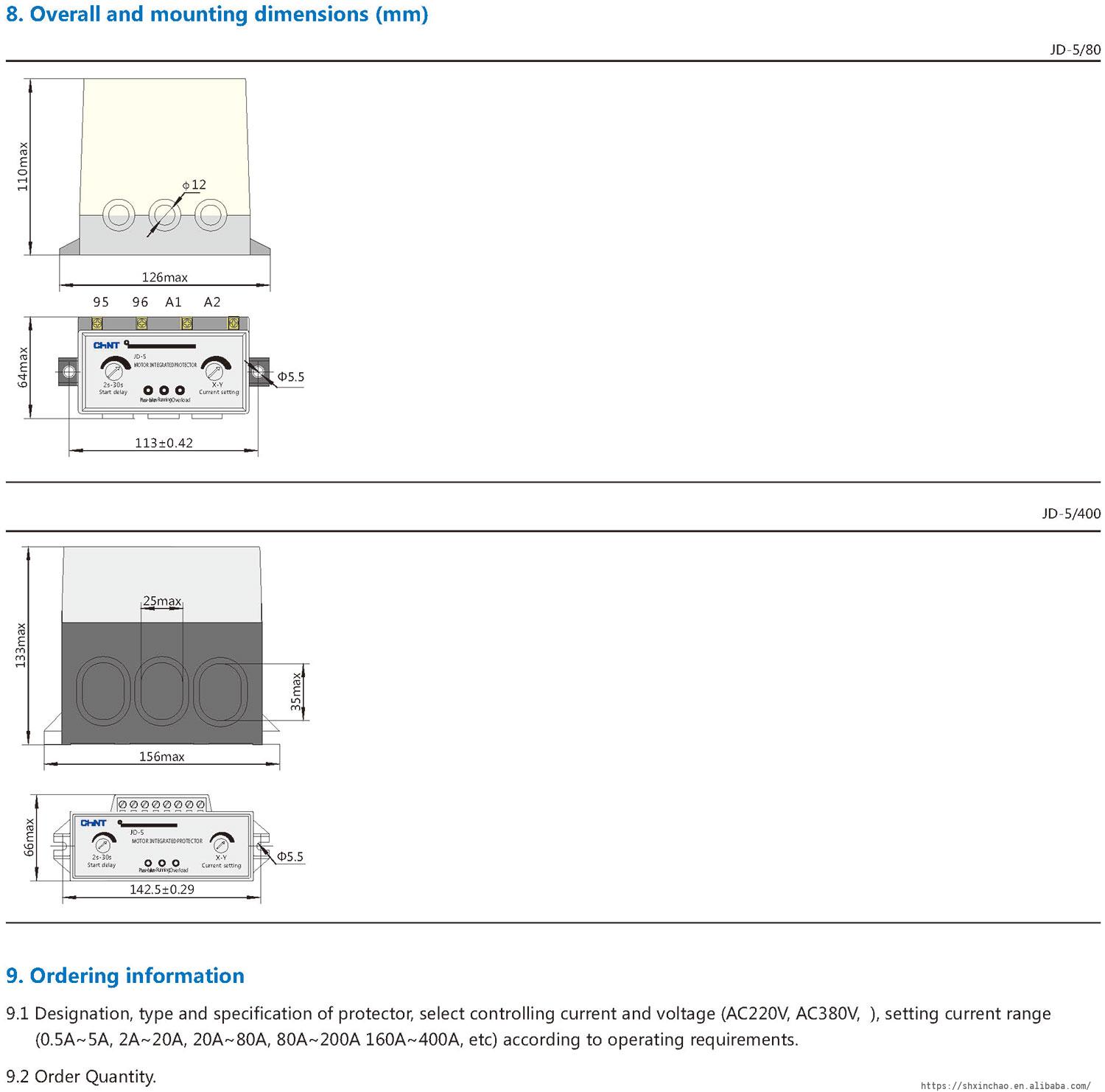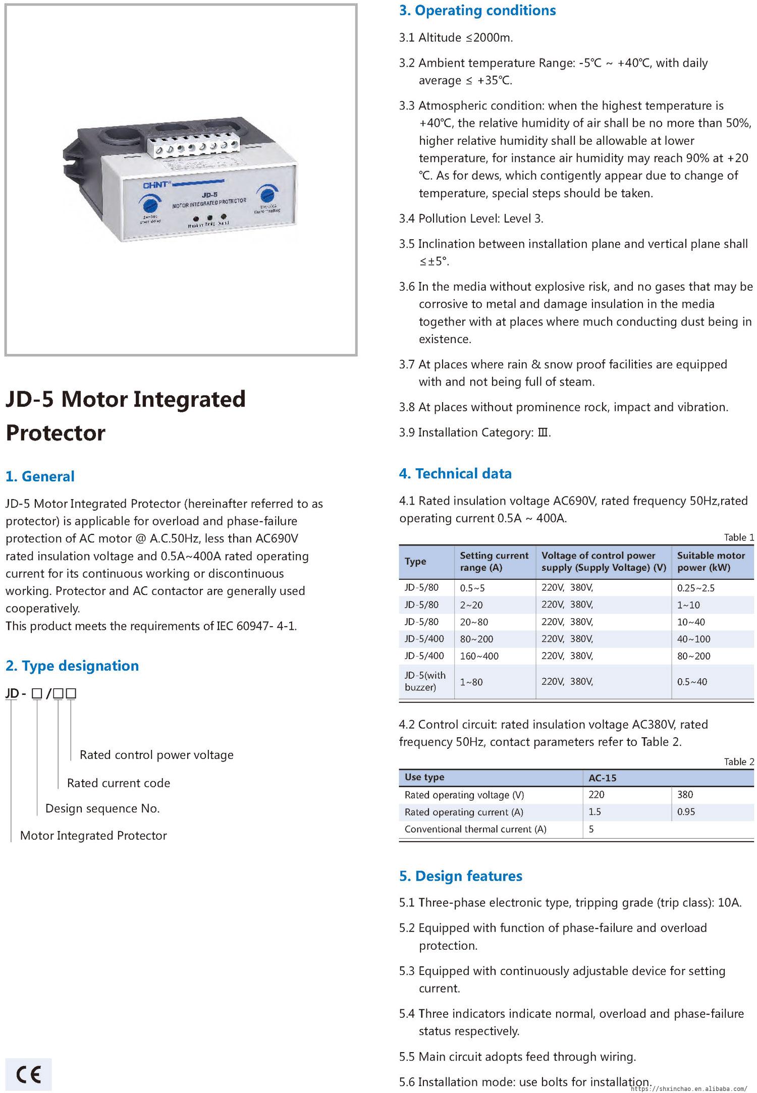 Chint JD-5 Integrated Protector (hereinafter referred to as protector) is applicable for overload and phase-failure protection of AC motor @ A.C.50Hz, less than AC690V rated insulation voltage and 0.5A~400A rated operating current for its continuous working or discontinuous working. Protector and AC contactor are generally used cooperatively.