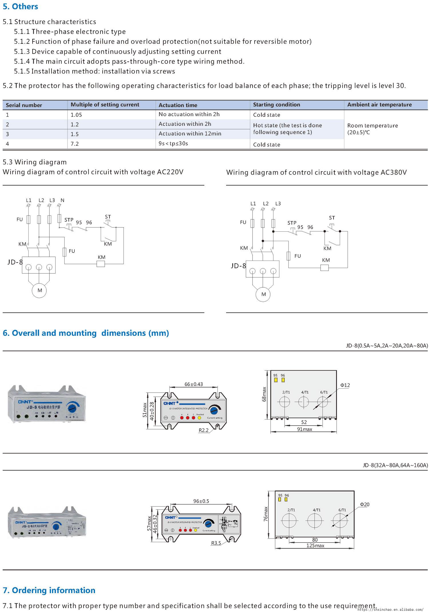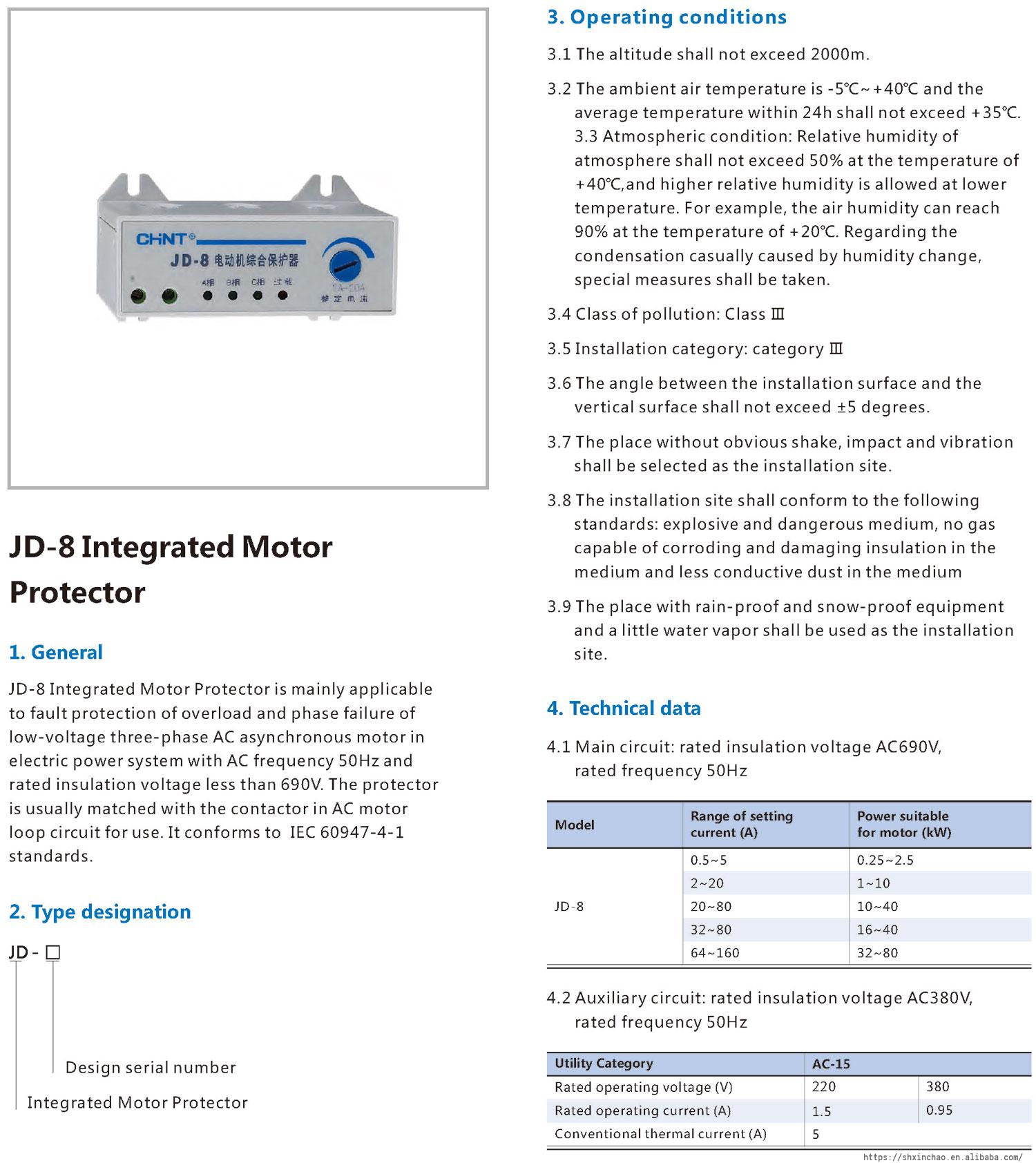 Chint JD-8 Integrated Motor Protector to fault protection of overload and phase failure of low-voltage three-phase AC asynchronous motor in electric power system with AC frequency 50Hz and rated insulation voltage less than 690V. The protector is usually matched with the contactor in AC motor loop circuit for use. It conforms to IEC 60947-4-1 standards.