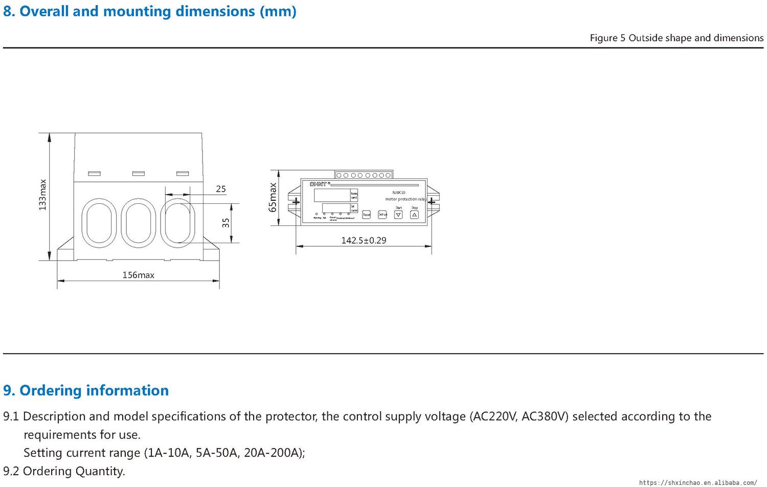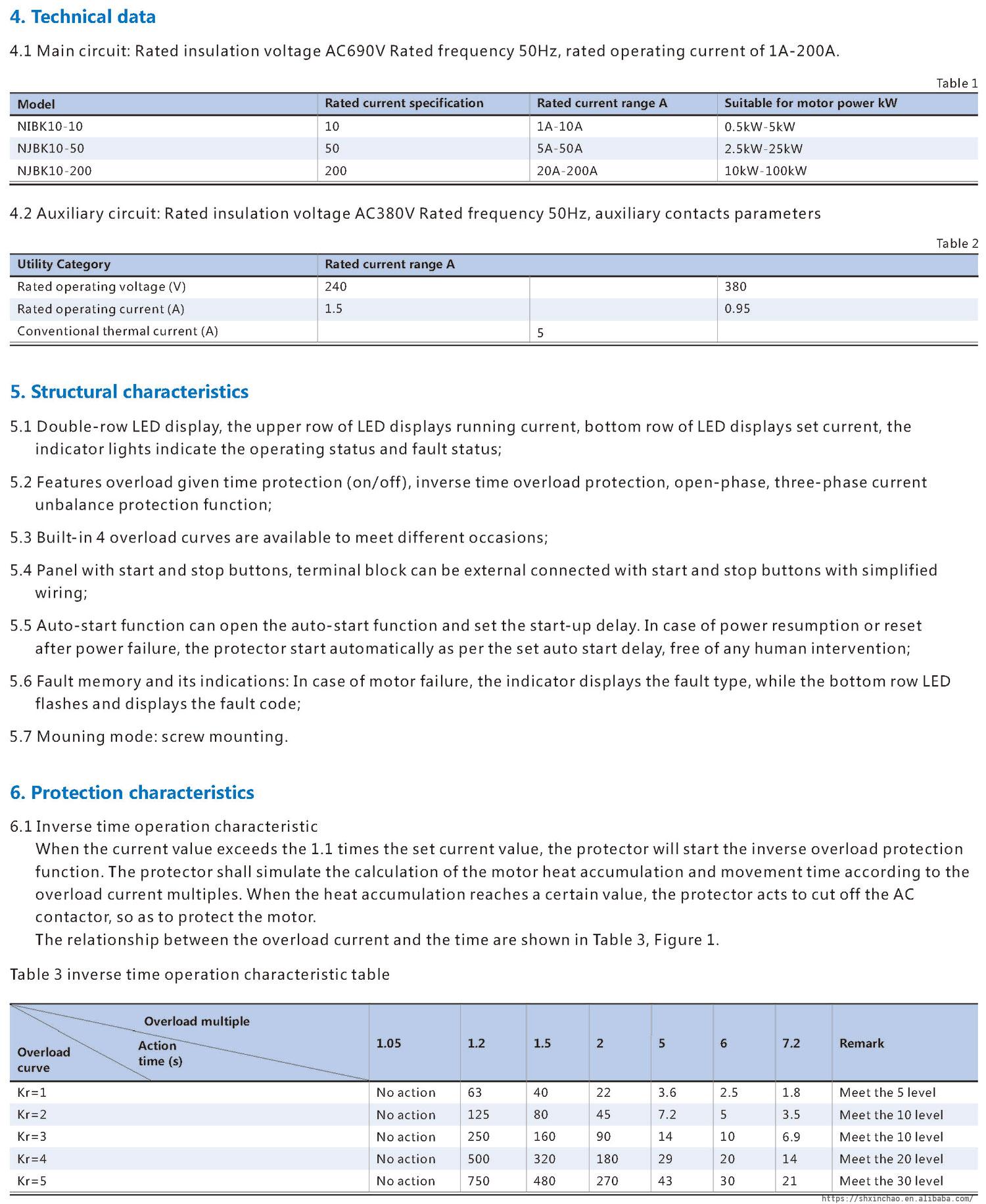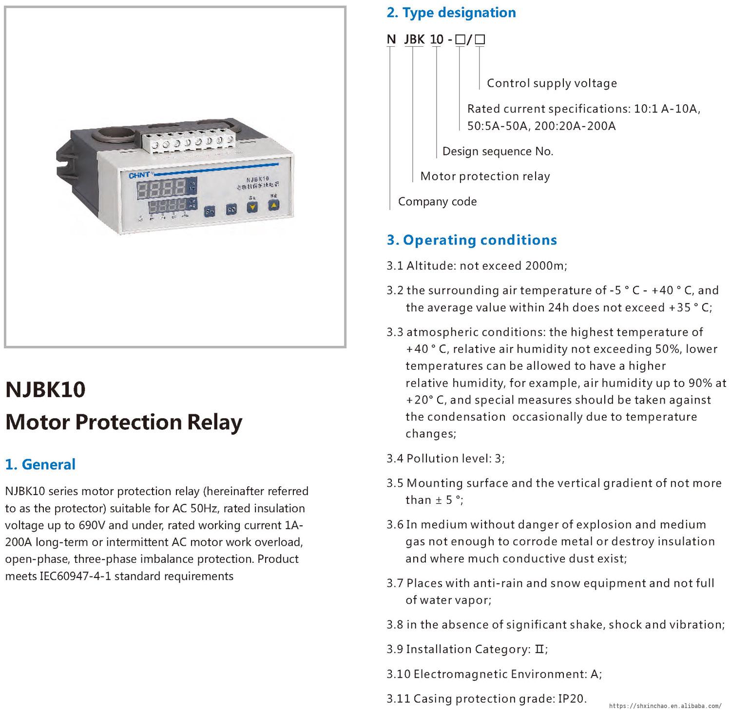 Chint NJBK10 series motor protection relay (hereinafter referred to as the protector) suitable for AC 50Hz, rated insulation voltage up to 690V and under, rated working current 1A- 200A long-term or intermittent AC motor work overload, open-phase, three-phase imbalance protection. Product meets IEC60947-4-1 standard requirements