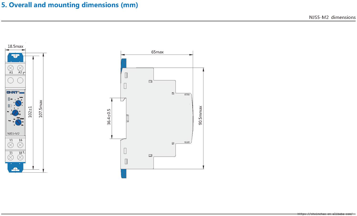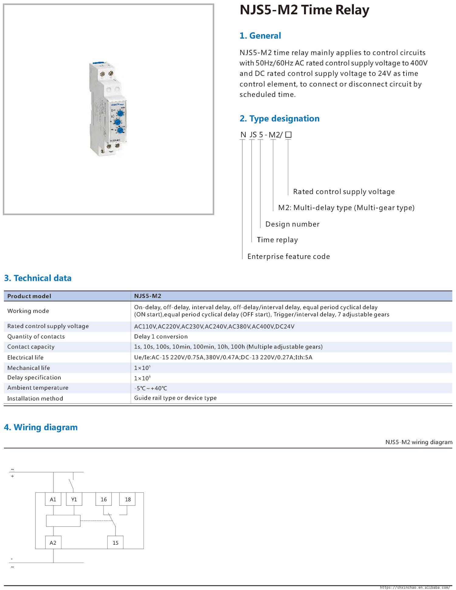 NJS5-M2 time relay mainly applies to control circuits with 50Hz/60Hz AC rated control supply voltage to 400V and DC rated control supply voltage to 24V as time control element, to connect or disconnect circuit by scheduled time.