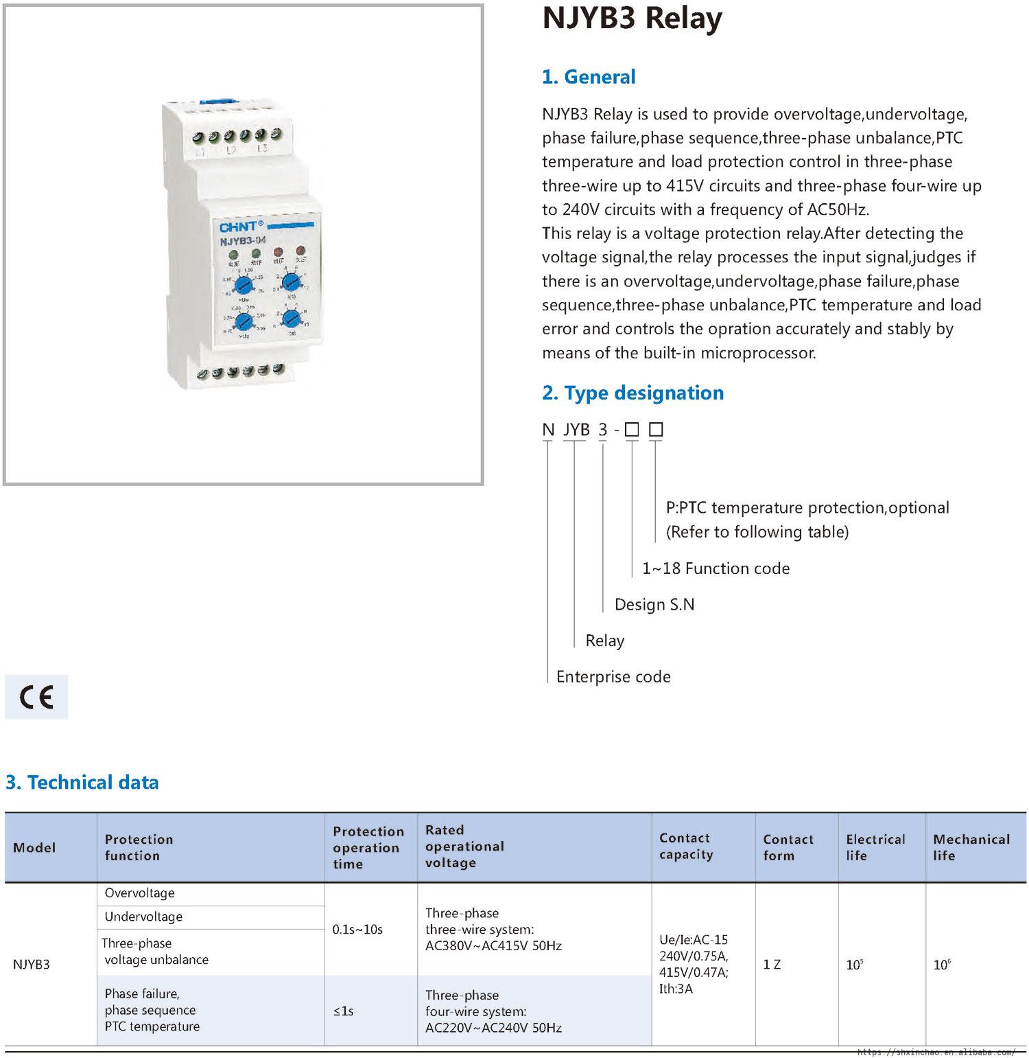 Chint NJYB3 Relay is used to provide overvoltage,undervoltage, phase failure,phase sequence,three-phase unbalance,PTC temperature and load protection control in three-phase three-wire up to 415V circuits and three-phase four-wire up to 240V circuits with a frequency of AC50Hz. This relay is a voltage protection relay.After detecting the voltage signal,the relay processes the input signal,judges if there is an overvoltage,undervoltage,phase failure,phase sequence,three-phase unbalance,PTC temperature and load error and controls the opration accurately and stably by means of the built-in microprocessor.