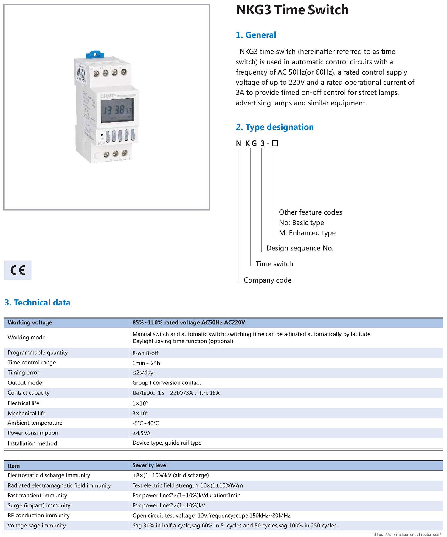 Chint NKG3 time switch (hereinafter referred to as time switch) is used in automatic control circuits with a frequency of AC 50Hz(or 60Hz), a rated control supply voltage of up to 220V and a rated operational current of 3A to provide timed on-off control for street lamps, advertising lamps and similar equipment.