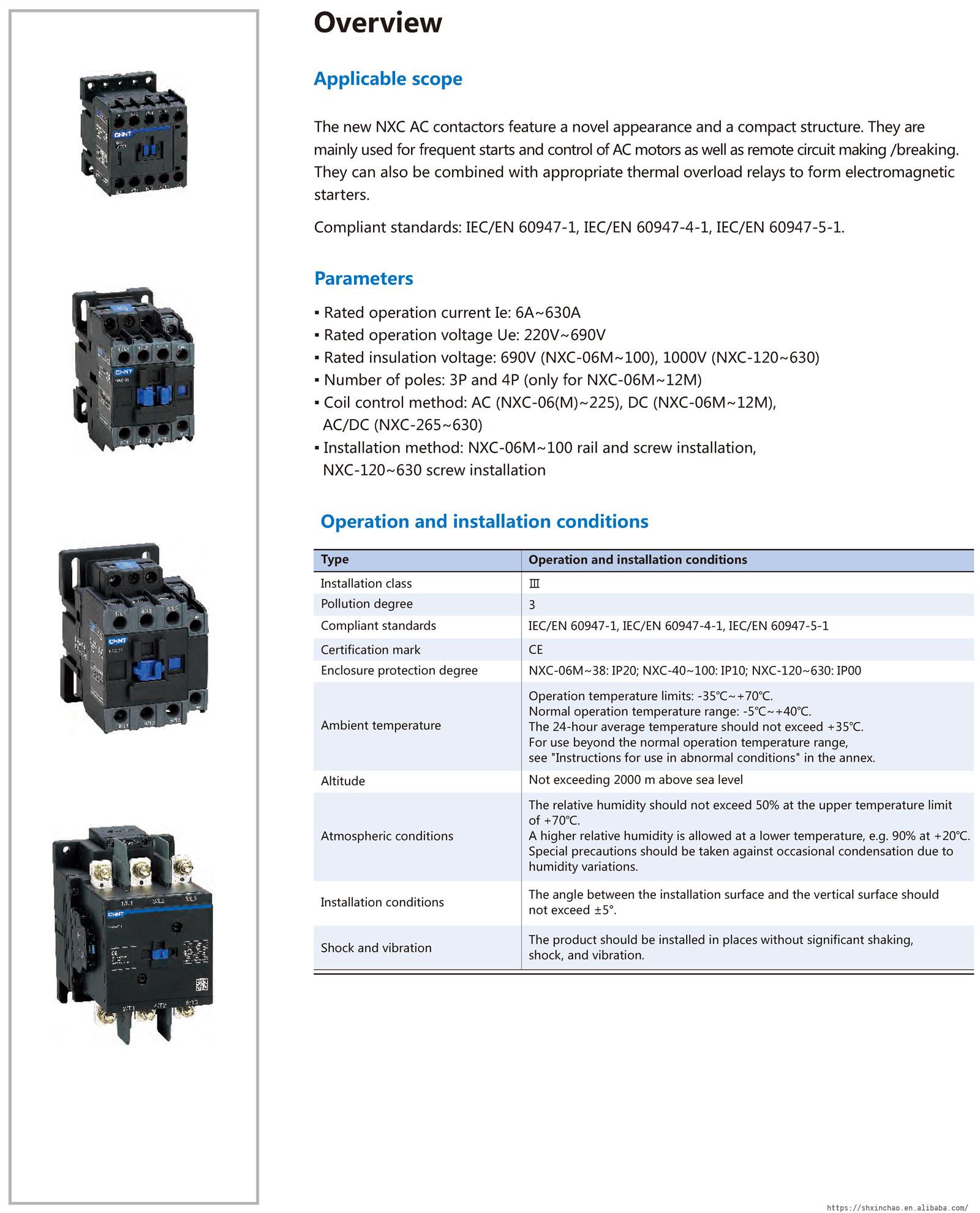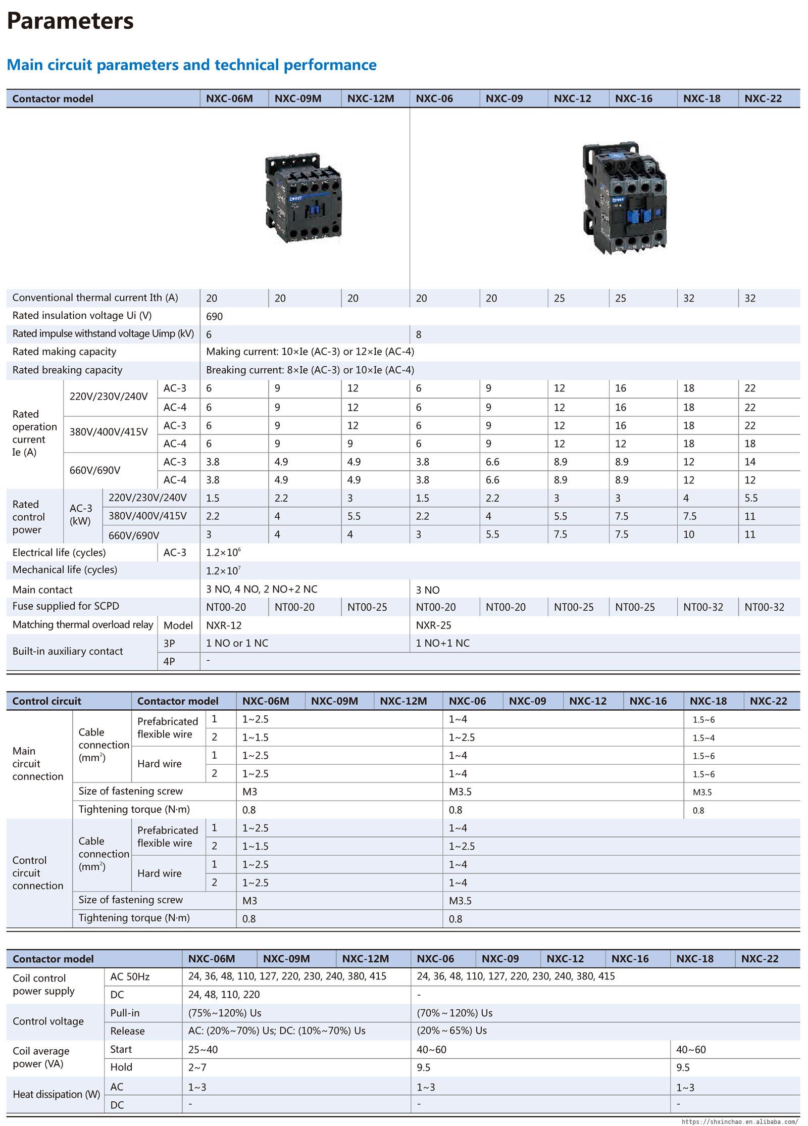 The new NXC AC contactors feature a novel appearance and a compact structure. They are mainly used for frequent starts and control of AC motors as well as remote circuit making /breaking. They can also be combined with appropriate thermal overload relays to form electromagnetic starters.