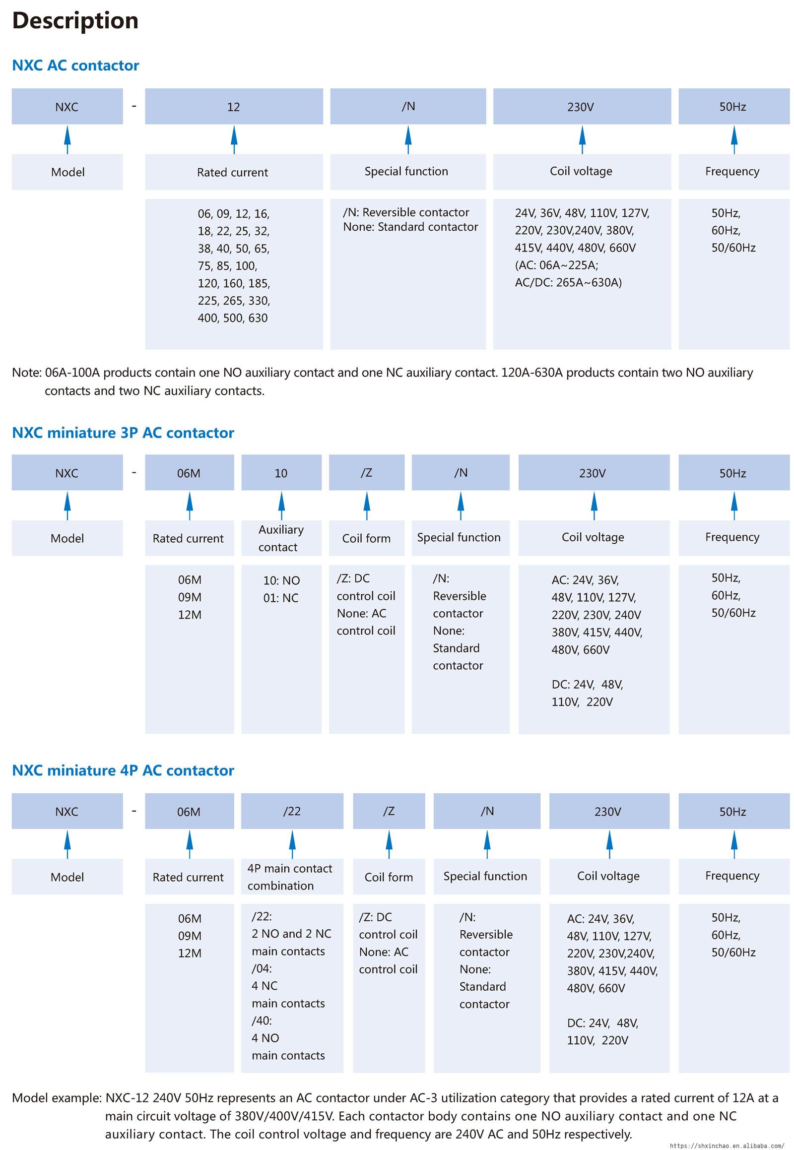 Coil control method: AC (NXC-06(M)~225), DC (NXC-06M~12M), AC/DC (NXC-265~630)