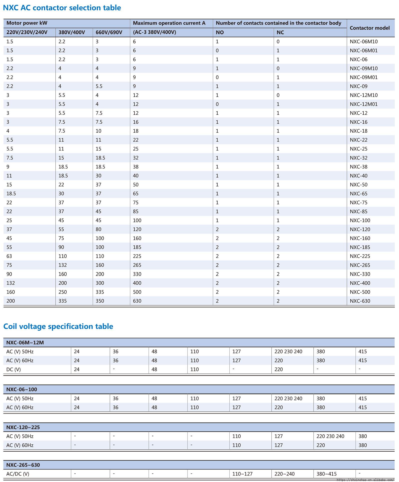 Coil control method: AC (NXC-06(M)~225), DC (NXC-06M~12M), AC/DC (NXC-265~630)