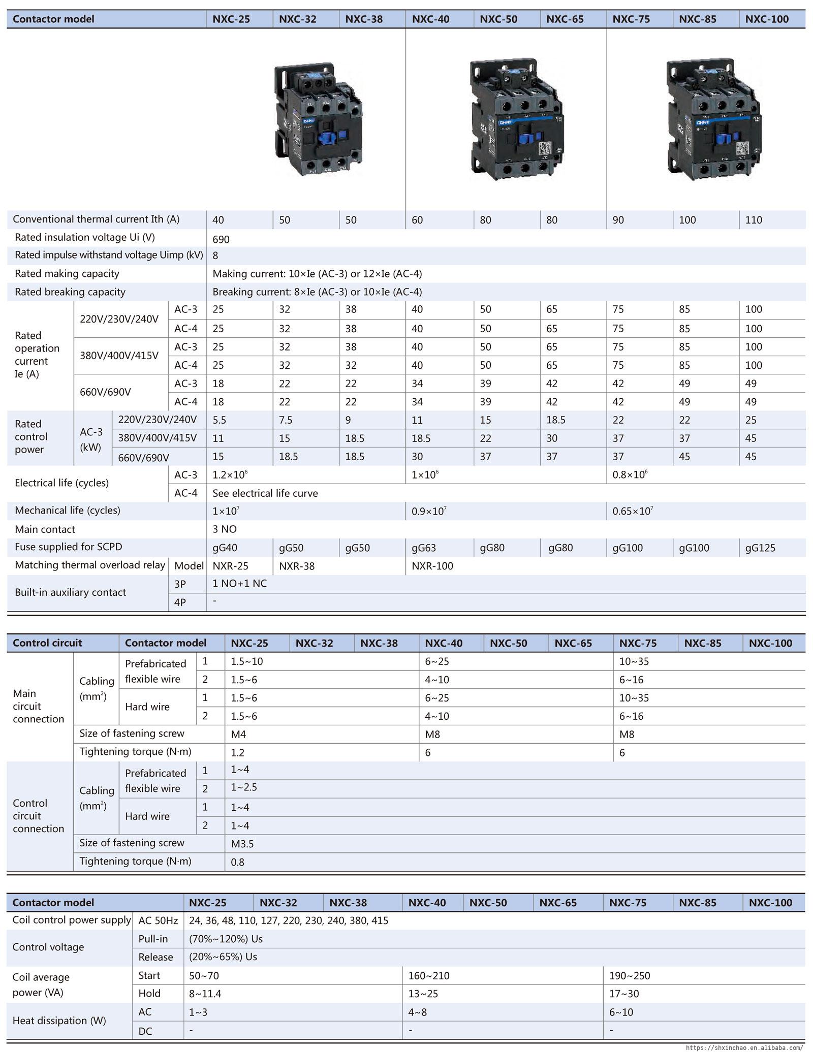 The new NXC AC contactors feature a novel appearance and a compact structure. They are mainly used for frequent starts and control of AC motors as well as remote circuit making /breaking. They can also be combined with appropriate thermal overload relays to form electromagnetic starters.