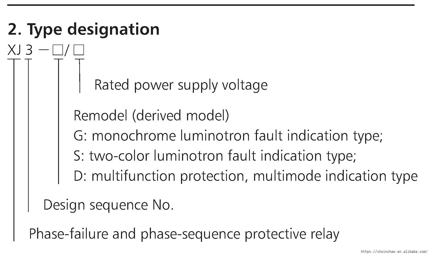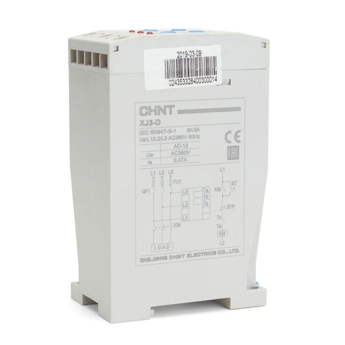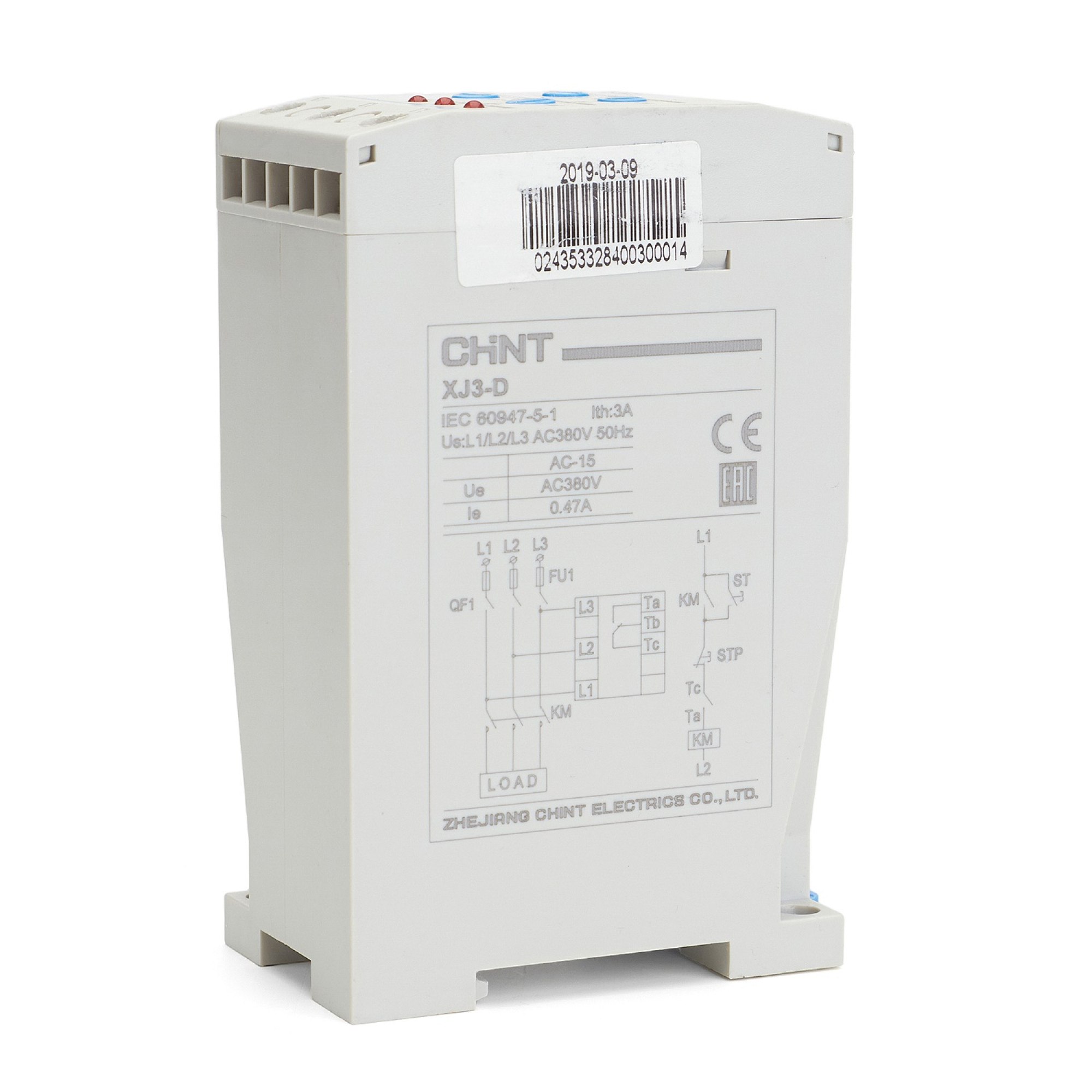 Chint XJ3 series phase failure and phase sequence protection relay is used to provide overvoltage, undervoltage and phase failure protection in three-phase AC circuits and phase sequence protection in irreversible transmission devices and features reliable performance, wide application and convenient use. The protector starts to function when it is connected to the power control circuit in accordance with the drawing. When the fuse of any phase of the three-phase circuit is open or when there is a phase failure in the power supply circuit, the XJ3 operates immediately to control the contact to cut off the power supply of the AC contactor coil of the main circuit so that the main contact of the AC contactor operates to provide the load with phase failure protection. When the phases of a three-phase irreversible device with predetermined phase sequence are connected incorrectly due to maintenance or change of the power supply circuit, the XJ3 series will identify the phase sequence, stop supplying power to the power supply circuit and achieve the goal of protecting the device.
