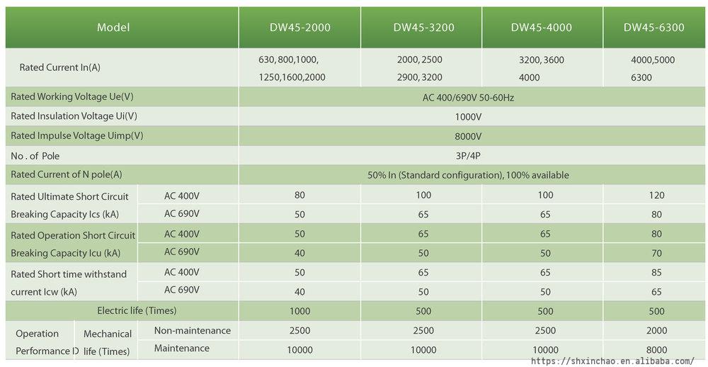 DW45 series Intelligent Air Circuit Breaker is extensively used as the main switch in the low voltage distribution switchboard of rated voltage of 1300V, rated current of 630A to 6300A, 50HZ or 60HZ. Its function is to control and protect the electr ical circuit from damage and prevent power equipments from harm of overload, under-voltage, short circuit and single phase earth etc. Provide with intelligent protecting function and precise selective protection, breaker can enhance the dependability of power supply and avoid unwanted power cut. It comply with IEC60947-2 standard.