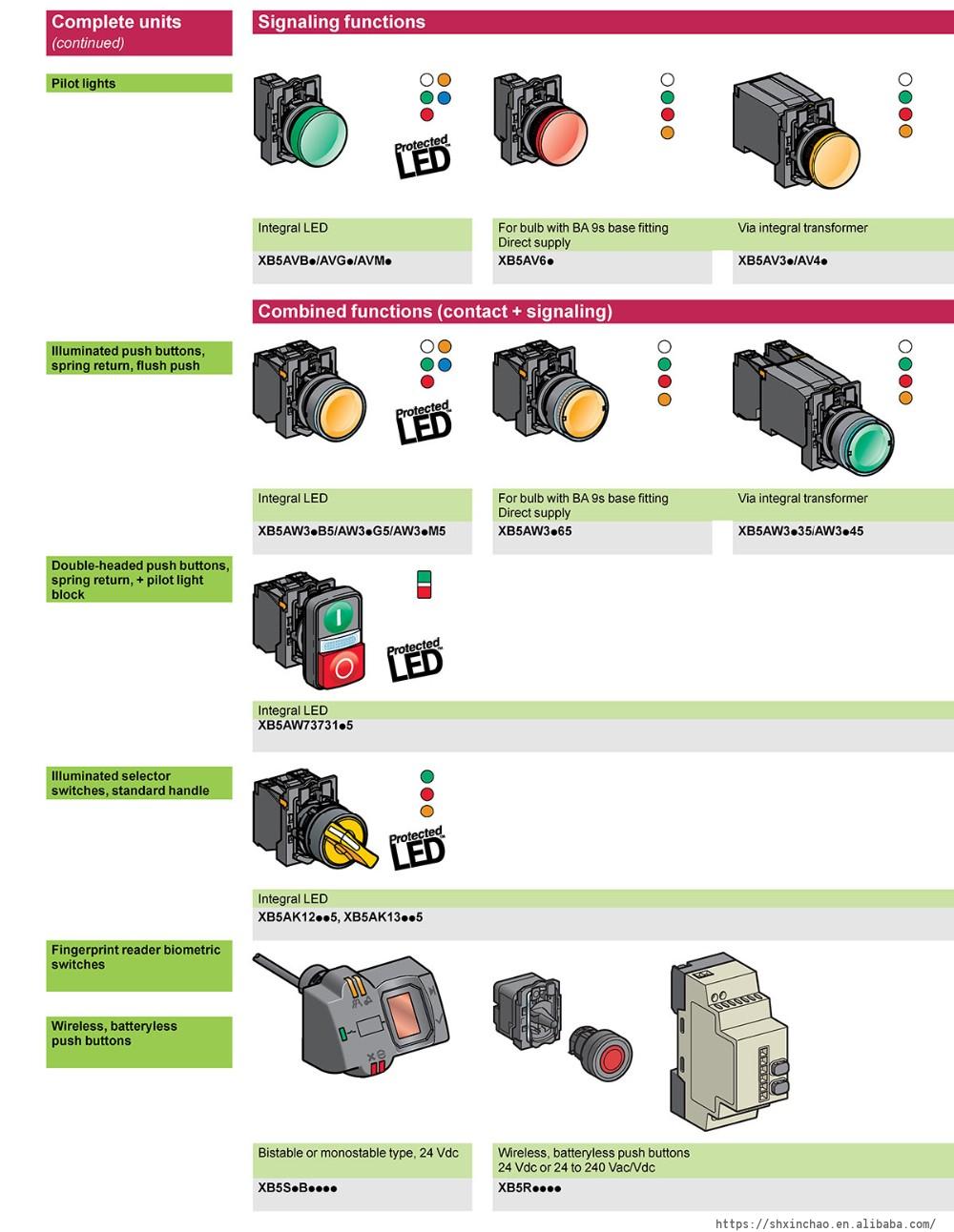 | XB5AL8465 | Green + Red | 1NO+1NC | 1 flush green + 1 convex red, with LED | |