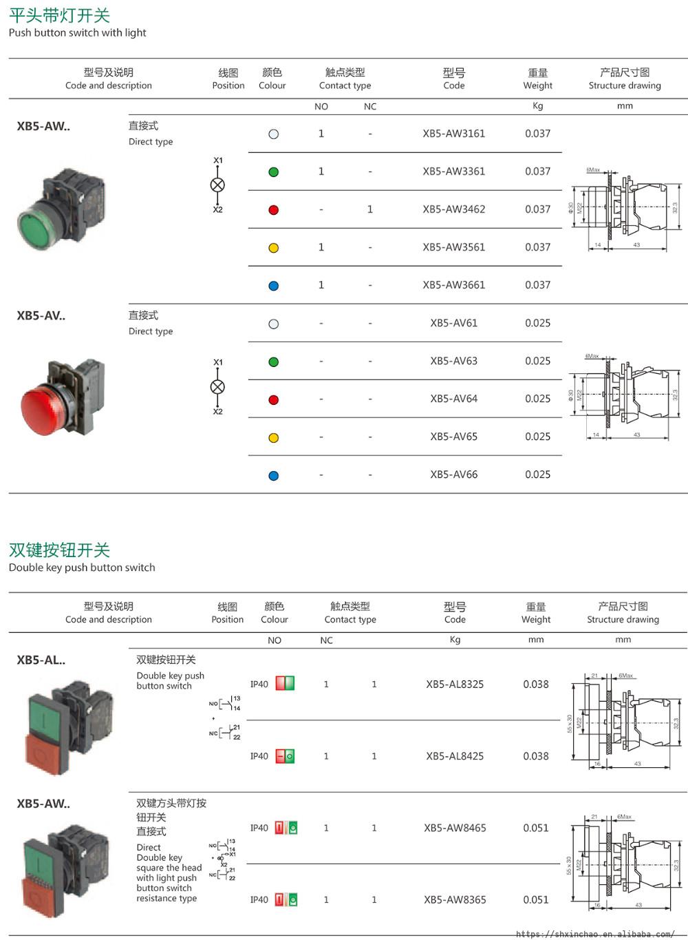 | XB5AL8325 | Green + Red | 1NO+1NC | Double-headed Pushbuttons, Spring return |