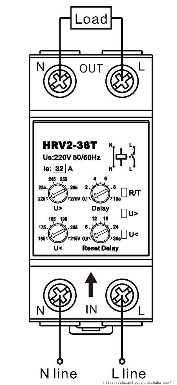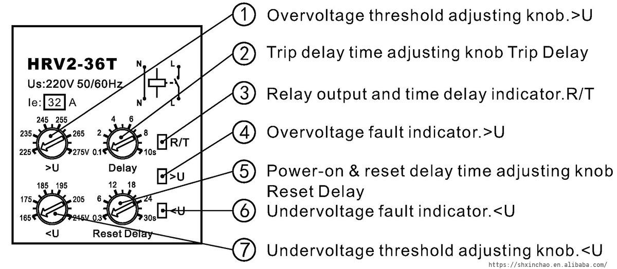 2.When the protector is with normal supply voltage, yellow R/T indicator stays light-on, relay implements output action; otherwise protector showsfault while relay gets disconnected.