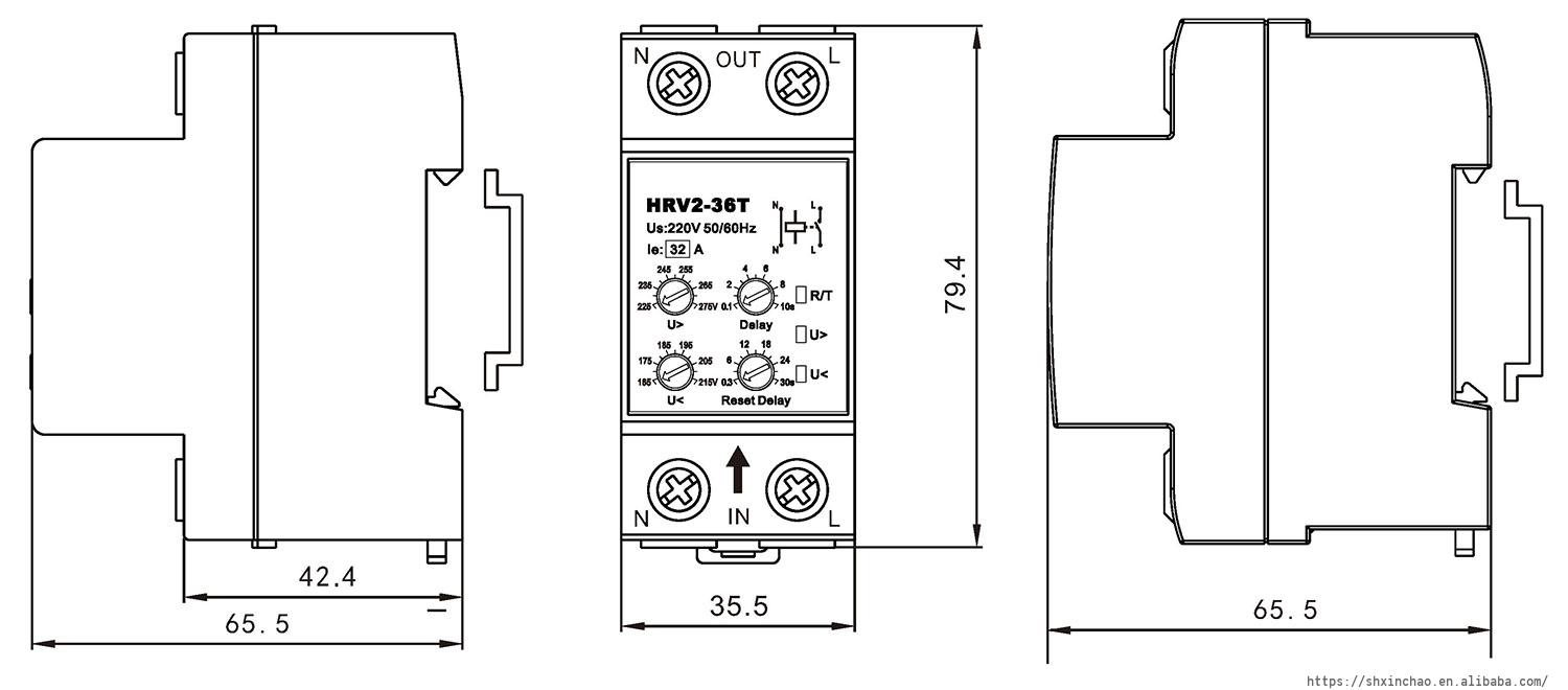 5.When supply voltage is lower than 150V, protector activates right away with no action delay;meanwhile,yellow R/T indicator light-off, red U< indicator light-on,and output relay gets disconnected.