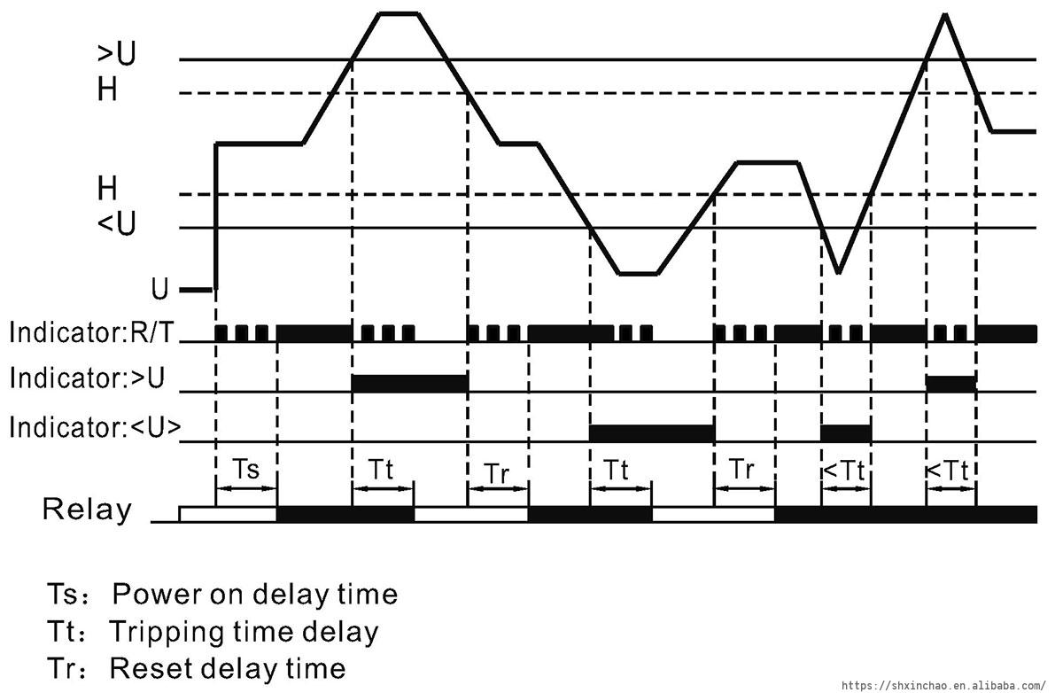 3.In case supply voltage goes over the set voltage operating value, yellow R/Tindicator flickers and red U > indicator light-on. When fault time islonger than the set delay time, output relay gets disconnected, R/T indicator light-off.And if supply voltage is lower than undervoltage operating value, yellow R/Tindicator flickers and red U< light-on. Also when fault time is longer than the set delay time, output relay gets disconnected, R/T indicator light-off.