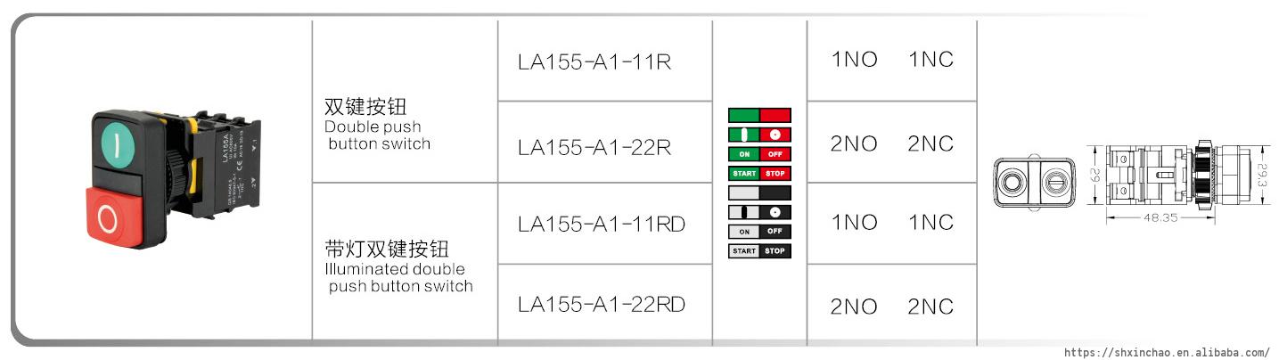 LA155-A1-11RD LA155-A1-22RD illuminated Start Stop Double headed push button with pilot light