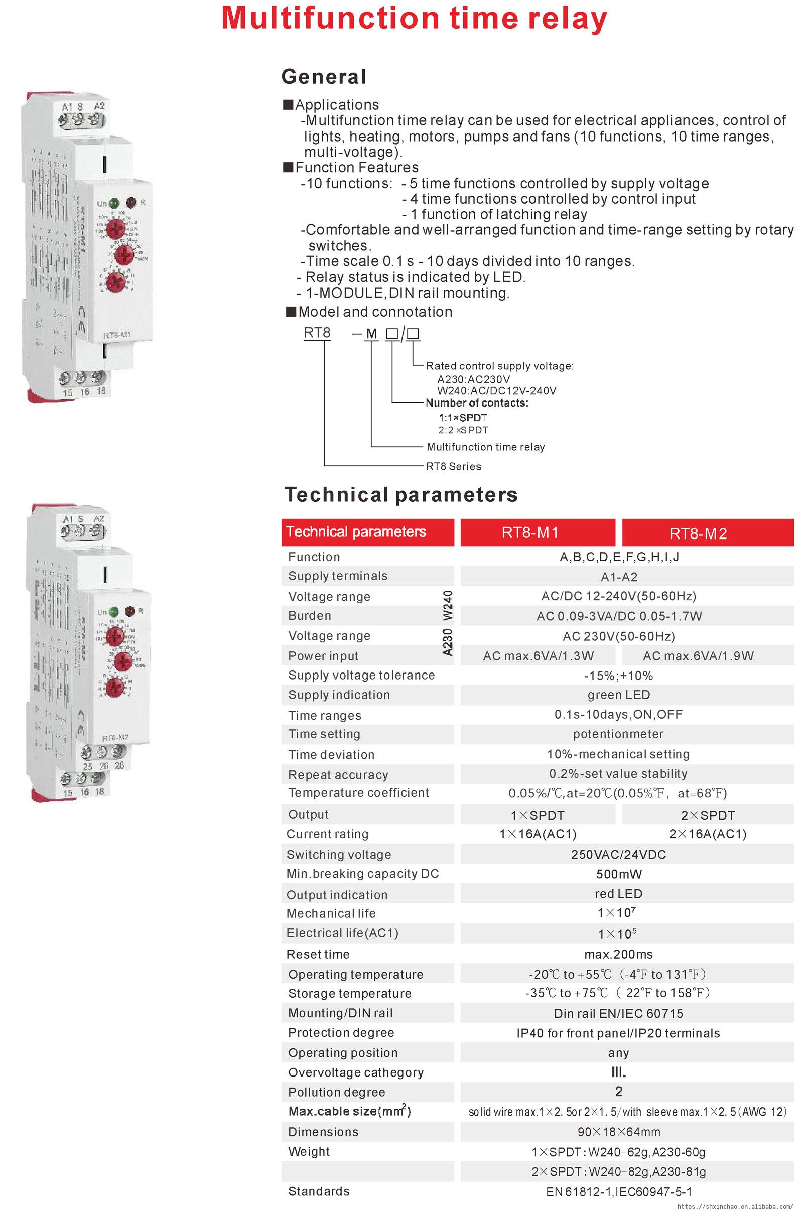 RT8-M1 RT8-M2 Multifunction time relay can be used For electric appliances, where is necessary to change the exact timing-controlling of the illumination, heating, motors, machines, ventilators, contactors.