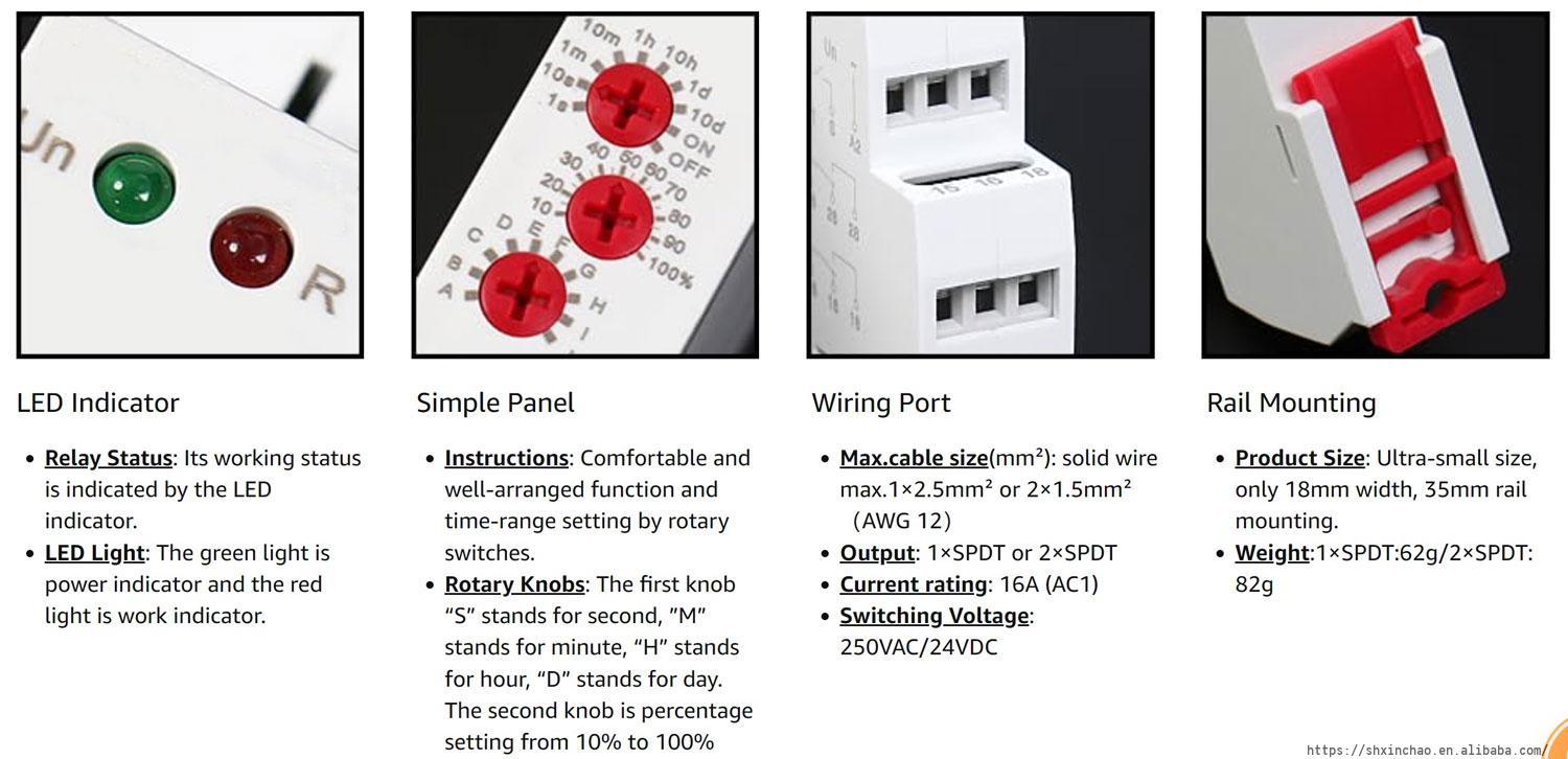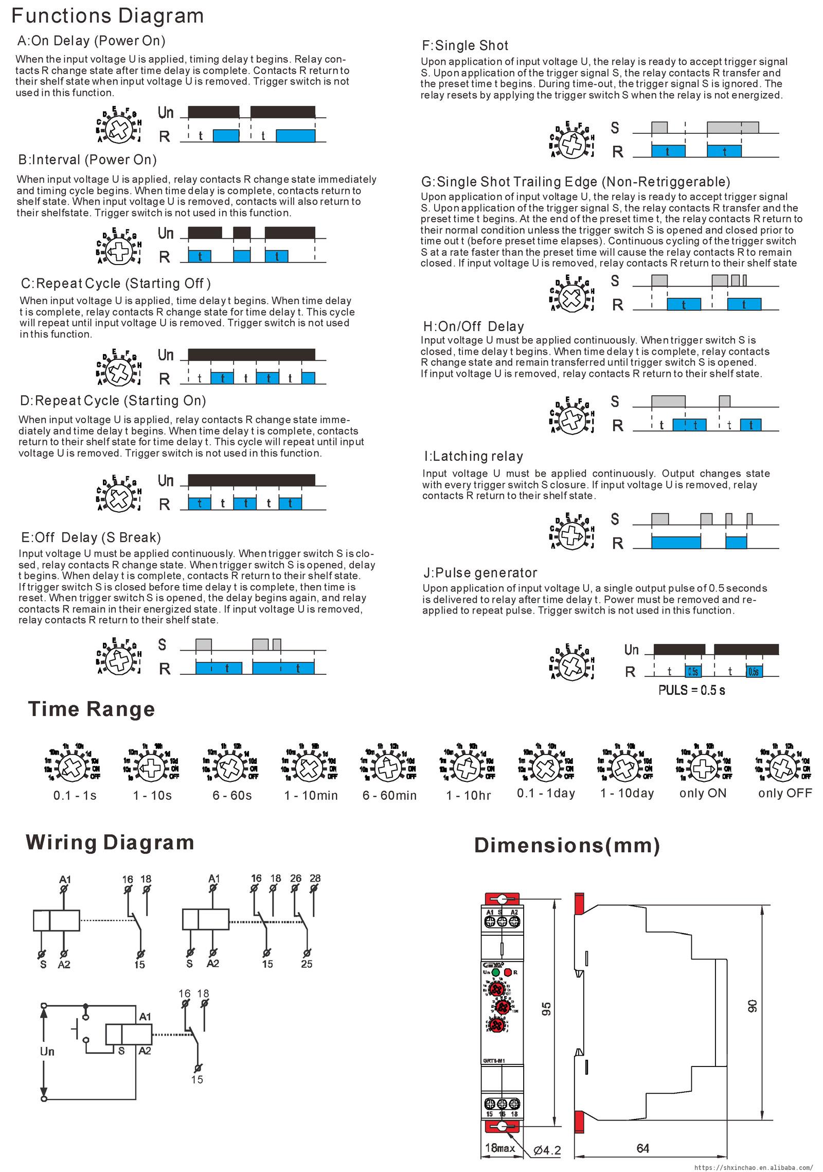 10 functions: Delay on, Delay off, Interval, Cycle, Single Shot, Latching, Pulse