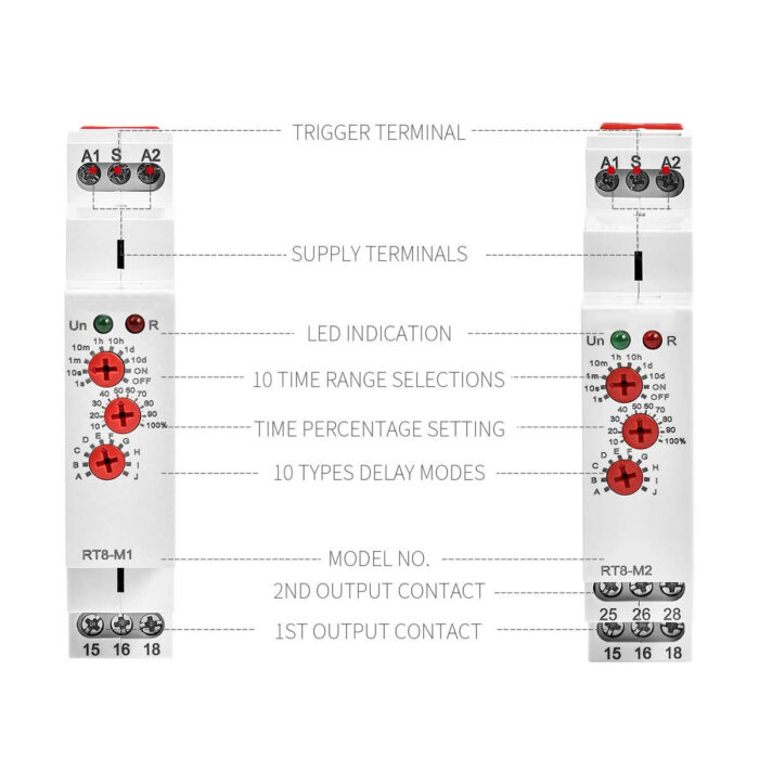 RT8-M1 RT8-M2 Multifunction time relay can be used For electric appliances, where is necessary to change the exact timing-controlling of the illumination, heating, motors, machines, ventilators, contactors.