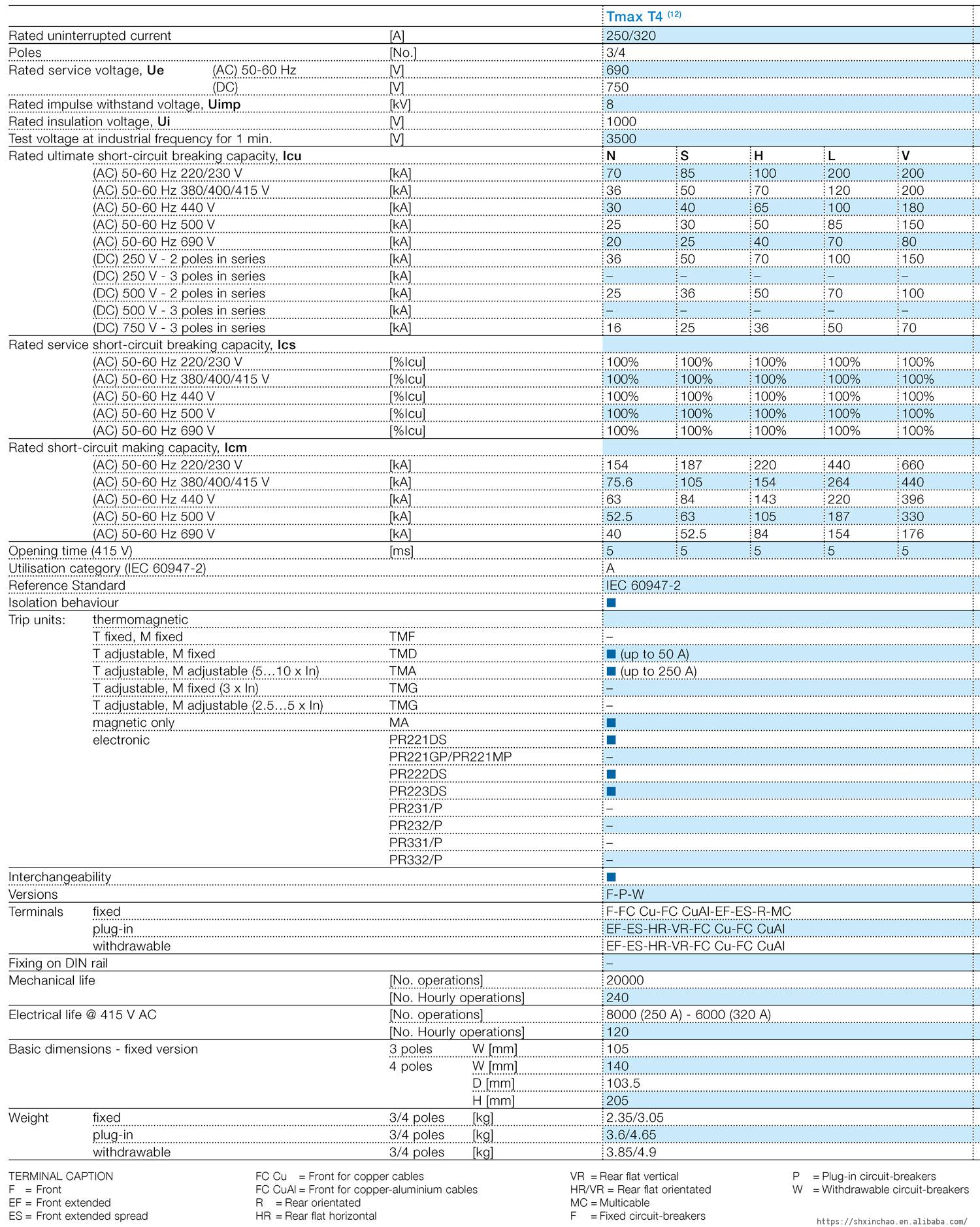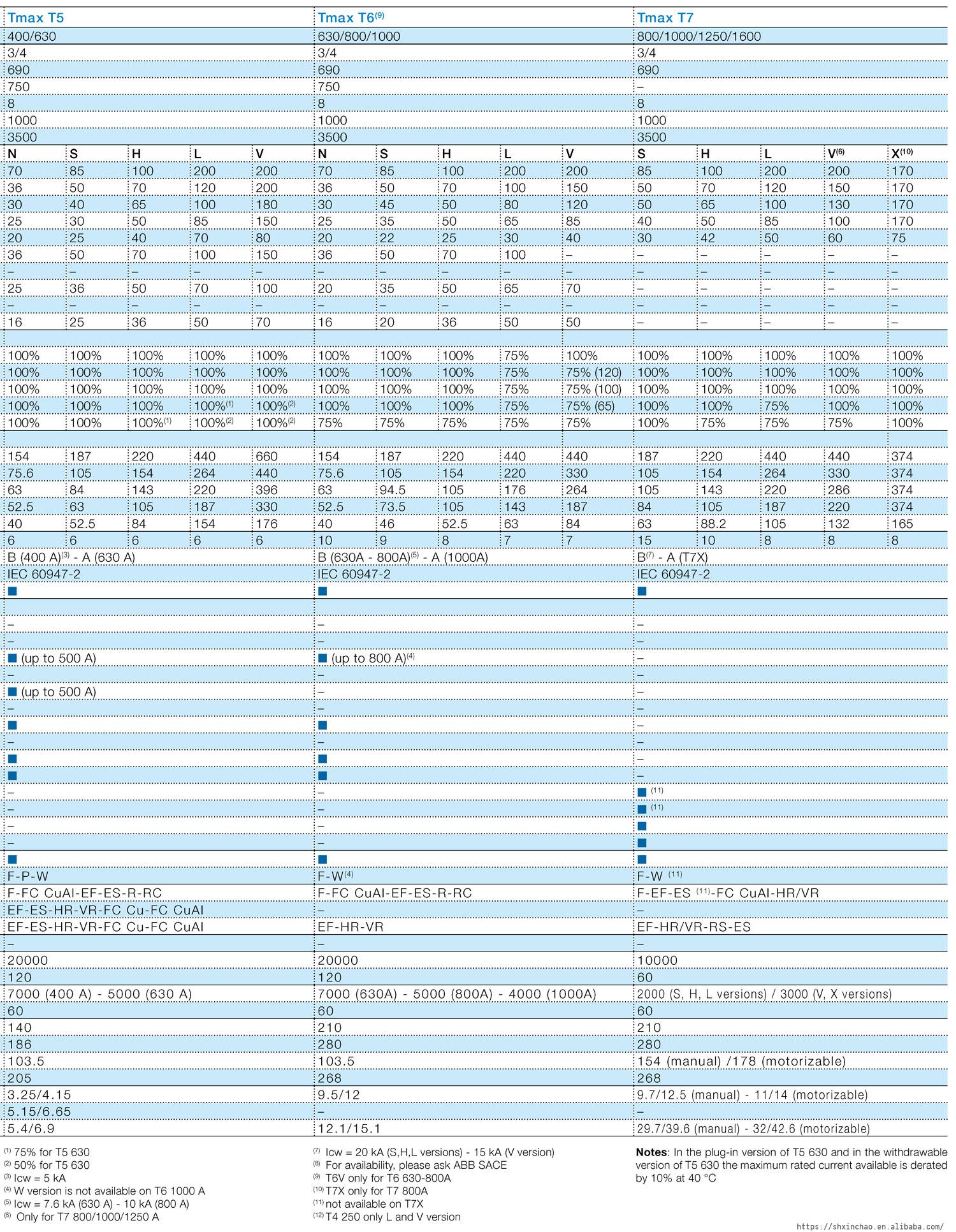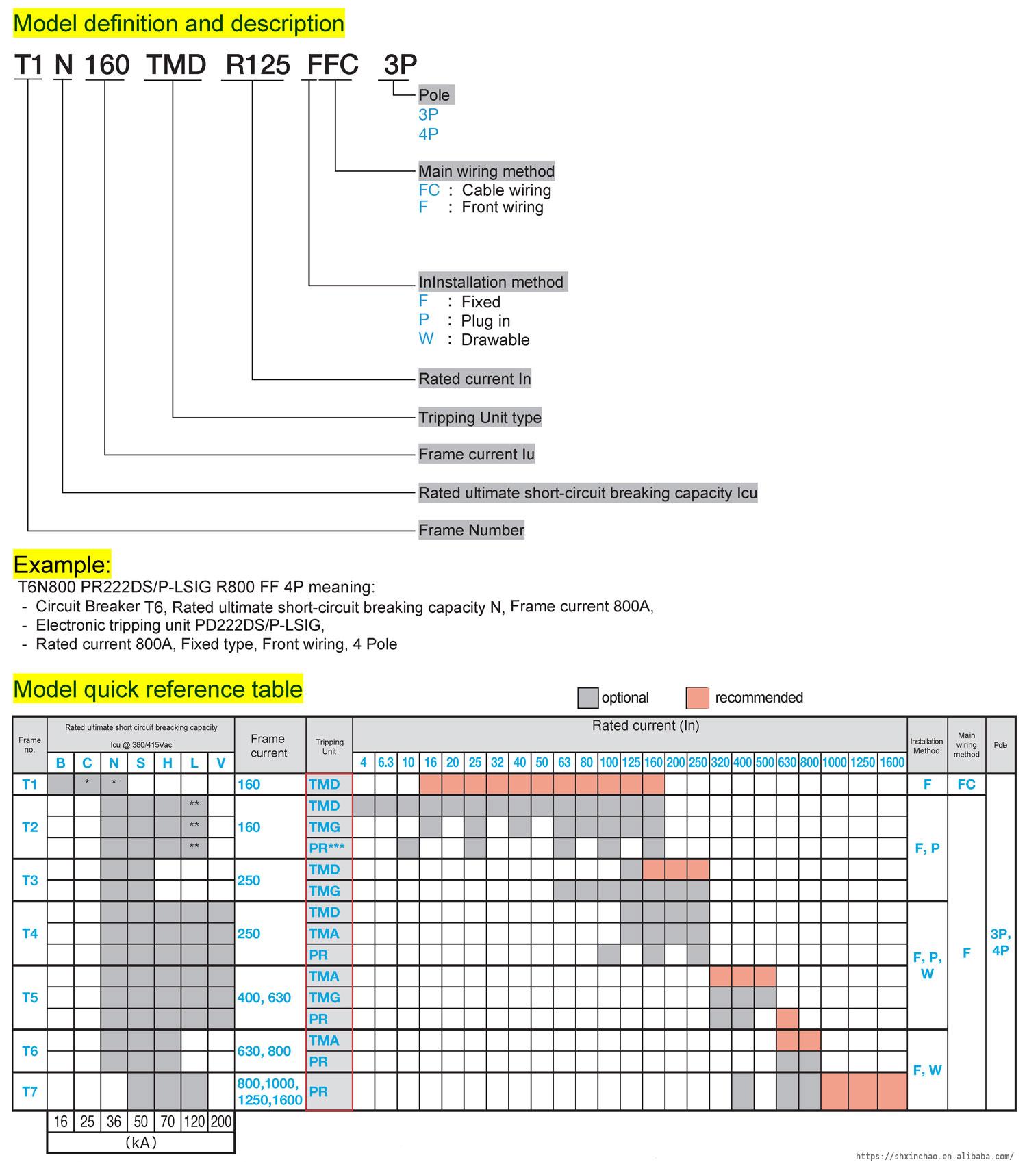 | Model Number | Tmax T7S (50kA), Tmax T7H (70kA), Tmax T7L (120kA) |